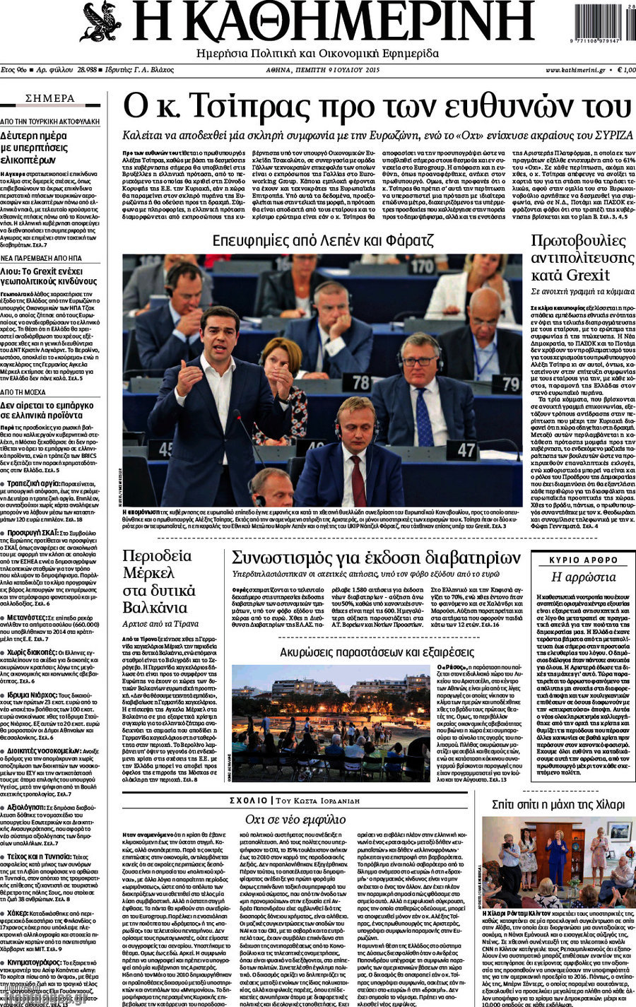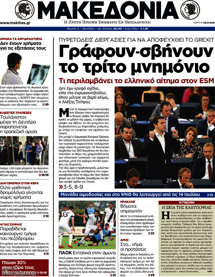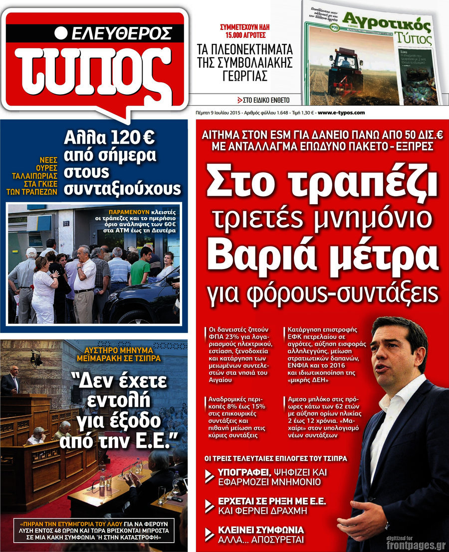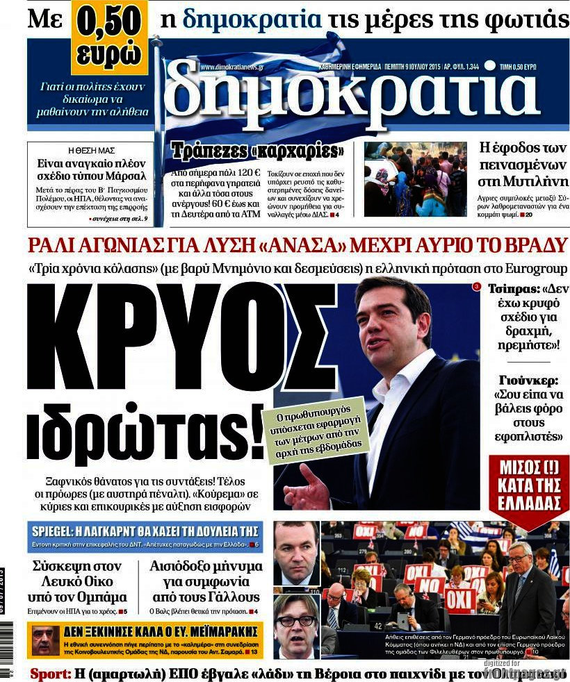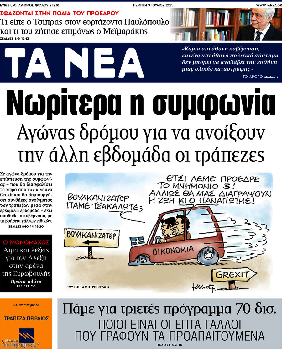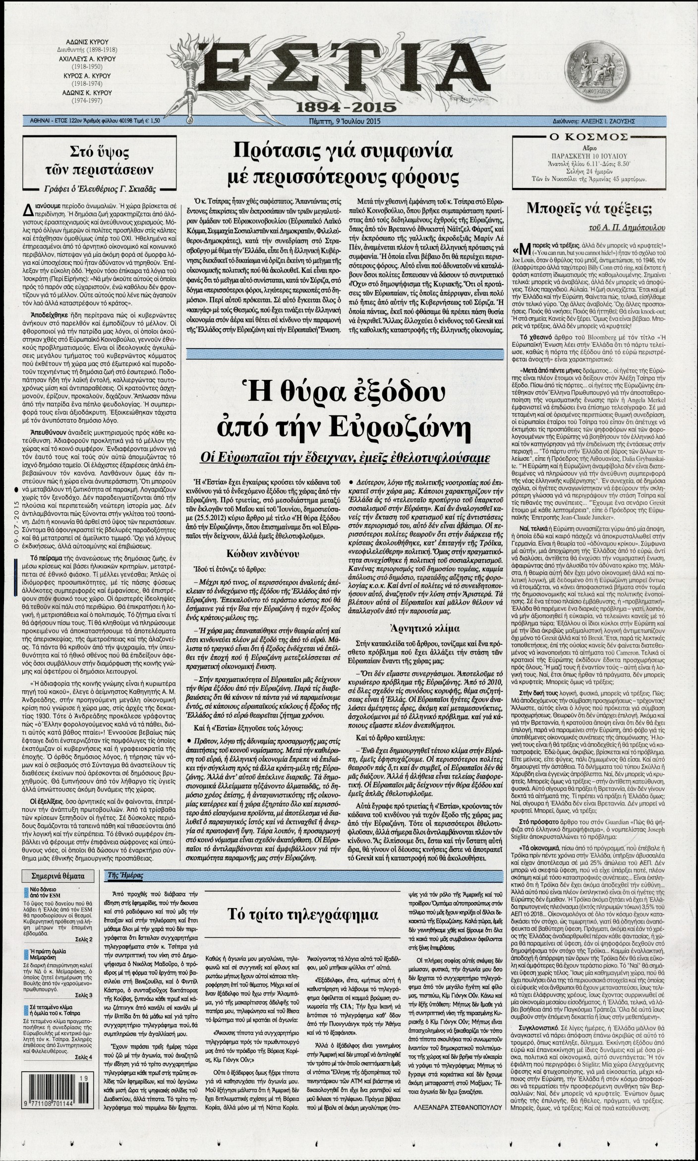 Οι πολιτικές εφημερίδες 9/7/2015 Enikos Newsroom 08:28, Πέμπτη 09 Ιουλίου 2015 Media Διαβάστε τα σημερινά πρωτοσέλιδα των σημερινών πολιτικών εφημερίδων: ΠΟΛΙΤΙΚΕΣ ΕΦΗΜΕΡΙΔΕΣ ΠΡΩΤΟΣΕΛΙΔΑ Μοιράσου το: σχολίασε κι εσύ (0 σχόλια) Ακολουθήστε το enikos.gr στο Google News και μάθετε πρώτοι όλες τις ειδήσεις Δείτε όλες τις τελευταίες ειδήσεις από την Ελλάδα και τον Κόσμο στο enikos.gr Ειδήσεις Ροή Ειδήσεων 28 λεπτά πριν «Έλληνας Εσκομπάρ»: Φωτογραφίες με τους 4 τόνους κοκαΐνης που κατασχέθηκαν από το σκάφος «Ουρανία» 3 ώρες πριν Η Ουκρανία χτύπησε τάνκερ του σκιώδους στόλου της Ρωσίας στη Μεσόγειο – Έπλεε νότια της Κρήτης 2 ώρες πριν Πούτιν: Σαρκαστικά μηνύματα, παράπονα και απρόοπτα στη συνέντευξη Τύπου – Η πρόταση γάμου on air και οι ερωτήσεις για τα αγγούρια και τους… εξωγήινους 2 ώρες πριν Η απάντηση της κυβέρνησης στα αιτήματα των αγροτών: 16+4 υλοποιούνται ή βρίσκονται υπό επεξεργασία για να βρεθεί λύση – 7 δεν μπορούν να επιλυθούν 3 ώρες πριν Εξώδικο επιχειρηματία στον Γιώργο Μαζωνάκη – Τι απαντά στις καταγγελίες του τραγουδιστή 1 ώρα πριν Τα 5 ζώδια που ευνοούνται στην ερωτική ζωή τους την επόμενη εβδομάδα – «Η ενέργεια του Αιγόκερου φέρνει αγάπη και σταθερότητα» 6 ώρες πριν Γεμάτος νεροχύτης; 5 σοβαρές ευθύνες που «φοβίζουν» όσους αφήνουν άπλυτα πιάτα 5 ώρες πριν Ειδικός μοιράζεται 6 κόλπα για να διατηρείστε σε φόρμα με πάνω από 40 ώρες εργασίας την εβδομάδα: «Προπονηθείτε πριν από τη δουλειά, όχι μετά» 2 ημέρες πριν 20 χρόνια τα Χριστούγεννα ξεκινούν στα Public με μεγάλη ποικιλία σε δώρα! 4 λεπτά πριν ΥΠΑΑΤ: Αναστολή μέτρων αναγκαστικής εκτέλεσης για κτηνοτρόφους που πλήττονται από την ευλογιά των αιγοπροβάτων 8 λεπτά πριν Γαλλία: Ξαφνική «επίσκεψη» των αγροτών στο σπίτι του Μακρόν – Πέταξαν κοπριά, λάχανα, λάστιχα και άφησαν ένα φέρετρο – ΒΙΝΤΕΟ 14 λεπτά πριν Από το Ορμένιο ως τα Μάλγαρα κι από τη Σιάτιστα μέχρι τη Νίκαια: Μπλόκα σε όλη την Ελλάδα – Το Σάββατο ανοίγουν τα διόδια οι αγρότες 15 λεπτά πριν Ταϊβάν: 3 νεκροί έπειτα από επίθεση άνδρα με μαχαίρι – Ο δράστης σκοτώθηκε σε αστυνομική καταδίωξη – ΒΙΝΤΕΟ 19 λεπτά πριν Άρης Μουγκοπέτρος για τα προσθετικά μέλη: «Οι κόρες μου ήρθαν, μου χαϊδέψαν το χέρι και μου είπαν “μπαμπά το μιμί πέρασε”» ENIKOS NETWORK ΕΛΣΤΑΤ: Αύξηση κατά 1,7% των επαγγελματιών υγείας το 2024 Τάξη στις ιατρικές διαφημίσεις για την προστασία των πολιτών βάζει ο ΙΣΑ Μετρό: Ενισχύονται τα δρομολόγια – Δείτε ποιες ημέρες Παπαθανάσης για νέο Εθνικό Πρόγραμμα Ανάπτυξης 2026-2030: Είναι υπερδιπλάσιο από αυτό της προηγούμενης προγραμματικής περιό... Χαρτογραφώντας το «σημείο χωρίς επιστροφή»: Για πρώτη φορά αποκαλύπτεται με λεπτομέρεια το ακανθώδες όριο της ατμόσφαιρας τ... Η Google καταργεί τη λειτουργία «dark web report» – Πώς θα μπορούν οι χρήστες να διαγράφουν τα δεδομένα τους περισσότερα 15:15 , Παρασκευή 19 Δεκεμβρίου 2025 Την Κυριακή με τη Realnews: Ό,τι και αν αγοράσεις, σκανάρεις και κερδίζεις! Την Κυριακή με τη Realnews: Ό,τι και αν αγοράσεις, σκανάρεις και κερδίζεις! Με το PADU app, το... 08:00 , Παρασκευή 19 Δεκεμβρίου 2025 Την Κυριακή με τη Realnews: Δωροεπιταγή 10€ Δωροεπιταγή αξίας 10€ για αγορές άνω των 60€ από τα πολυκαταστήματα FactoryOutlet H προσφορά ι... 05:48 , Παρασκευή 19 Δεκεμβρίου 2025 Οι οικονομικές εφημερίδες 19/12/2025 Διαβάστε τα πρωτοσέλιδα από τις οικονομικές εφημερίδες, σήμερα 19/12/2025. 05:43 , Παρασκευή 19 Δεκεμβρίου 2025 Οι αθλητικές εφημερίδες 19/12/2025 Διαβάστε τα πρωτοσέλιδα από τις αθλητικές εφημερίδες, σή