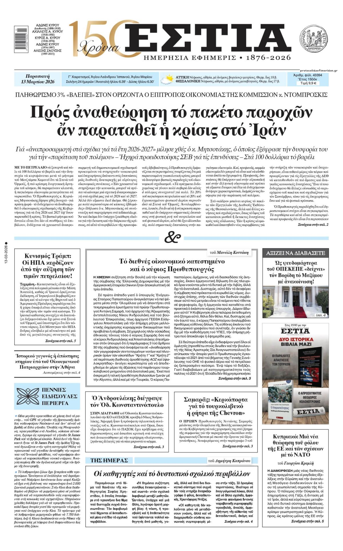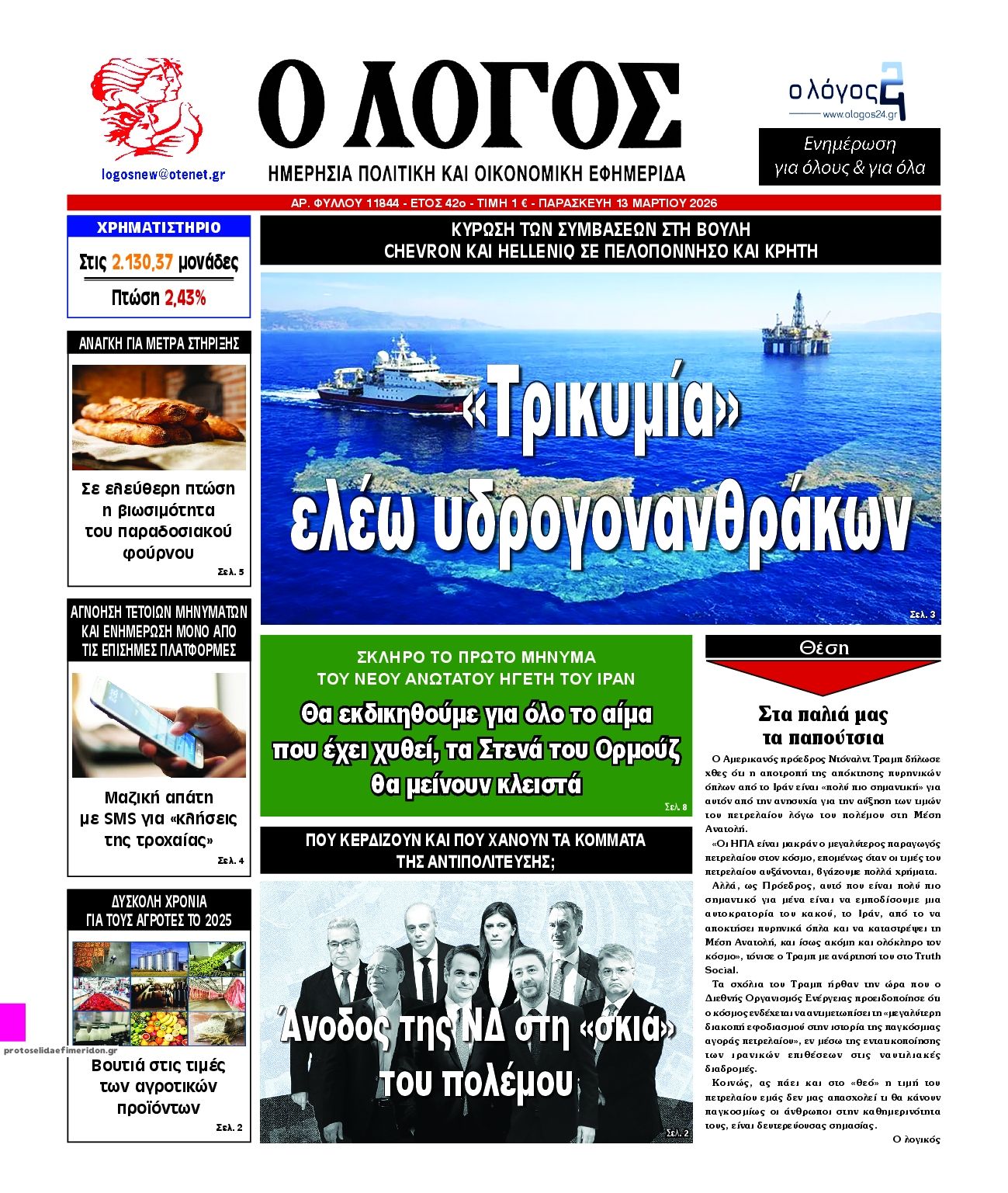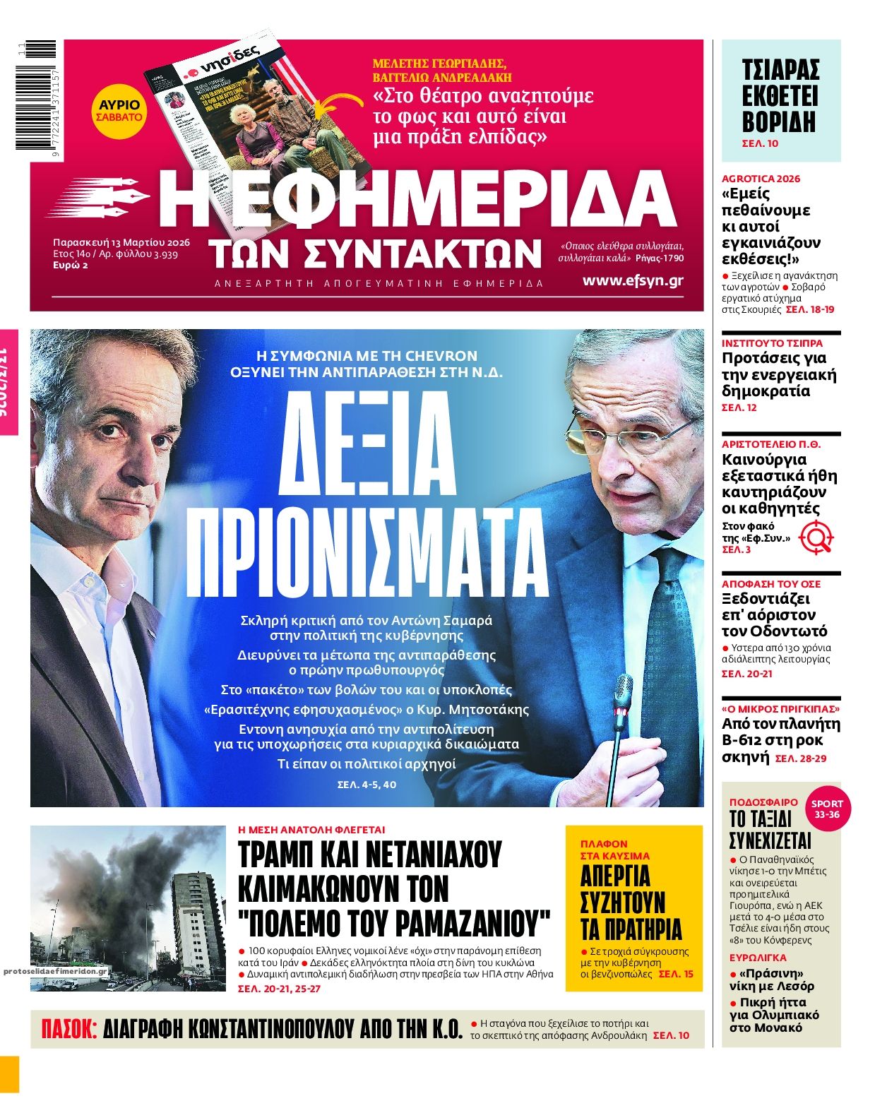 Οι πολιτικές εφημερίδες 13/3/2026 Γιωργος Λαμπρόπουλος 05:38, Παρασκευή 13 Μαρτίου 2026 Media Διαβάστε τα πρωτοσέλιδα από τις πολιτικές εφημερίδες, σήμερα 13/3/2026. ΕΦΗΜΕΡΙΔΕΣ ΠΟΛΙΤΙΚΕΣ ΕΦΗΜΕΡΙΔΕΣ ΠΡΩΤΟΣΕΛΙΔΑ Μοιράσου το: Οι ΗΠΑ έδωσαν προσωρινή άδεια για πώληση ρωσικού πετρελαίου Financial Times: Οι ΗΠΑ εξάντλησαν σημαντικά αποθέματα όπλων στον πόλεμο με το Ιράν Η Ισλαμική Αντίσταση στο Ιράκ ανέλαβε την ευθύνη για την κατάρριψη του αμερικανικού στρατιωτικού αεροσκάφους σχολίασε κι εσύ (0 σχόλια) Ακολουθήστε το enikos.gr στο Google News και μάθετε πρώτοι όλες τις ειδήσεις Δείτε όλες τις τελευταίες ειδήσεις από την Ελλάδα και τον Κόσμο στο enikos.gr Ειδήσεις Ροή Ειδήσεων 23 ώρες πριν LIVE – 13η ημέρα πολέμου ΗΠΑ – Ισραήλ με Ιράν – Οι εξελίξεις 8 ώρες πριν Τραμπ: Γιατί δεν έχει εύκολες λύσεις για τον τερματισμό του πολέμου – Τα λάθη, η υποτίμηση του αντιπάλου και η κόλαση στο Ορμούζ 8 ώρες πριν Οδυσσέας Κωνσταντινόπουλος: Η πρώτη αντίδραση για τη διαγραφή του – «Το τελευταίο καταφύγιο μιας φοβικής ηγεσίας» 9 ώρες πριν Κατασκοπεία στη Σούδα: Βρέθηκαν φωτογραφίες πολεμικών πλοίων στο κινητό του Πολωνού – Αρνείται τις κατηγορίες ο ίδιος 10 ώρες πριν Παναθηναϊκός – Μπέτις 1-0: Μεγάλη νίκη και προβάδισμα για την πρόκριση 58 λεπτά πριν Οπτική ψευδαίσθηση: Μόνο αν είσαι ο Σέρλοκ Χολμς θα βρεις την λεοπάρδαλη σε 15 δευτερόλεπτα 1 ώρα πριν Έλλειψη βιταμίνης D: Πώς συνδέεται με τη χρόνια φλεγμονή, σύμφωνα με νέα μελέτη 4 ώρες πριν Ζώδια 13/3: Ημερήσιες προβλέψεις – Κριοί, φτιάχνετε κάτι που θα κρατήσει 9 ώρες πριν Παγκόσμια Ημέρα Ύπνου 2026: 5 απλές συνήθειες που θα σας βοηθήσουν να κοιμάστε καλύτερα 48 λεπτά πριν Αυτή την Κυριακή με τη Realnews: «Στις μυστικές υπηρεσίες της Μαρίας Αντουανέτας – Τα διαμάντια του θανάτου» – Μυστικά και ίντριγκες στα ανάκτορα των Βερσαλλιών – Από τον συγγραφέα Frédéric Lenormand 2 λεπτά πριν Οι αθλητικές μεταδόσεις της Παρασκευής 13/3/2026 – Παναθηναϊκός-Ολυμπιακός, Euroleague & Ποδόσφαιρο 13 λεπτά πριν Την Κυριακή με τη Realnews: Ό,τι και αν αγοράσεις, σκανάρεις και κερδίζεις! 21 λεπτά πριν UNESCO: Καταστροφές σε μνημεία παγκόσμιας πολιτιστικής κληρονομιάς στο Ιράν λόγω του πολέμου 38 λεπτά πριν ΔΕΔΔΗΕ: Διακοπές ρεύματος σήμερα (13/3) στην Αθήνα και σε άλλες 9 περιοχές της Αττικής ENIKOS NETWORK Είστε τόσο παρατηρητικοί ώστε να βρείτε τις 3 διαφορές στην εικόνα με τον ζωγράφο σε 79 δευτερόλεπτα; Το αρωματικό λαχανικό των Νεμεών που μπορεί να βελτιώσει τη χώνευση και να μειώσει τη φλεγμονή Πώς θα εφαρμοστεί το πλαφόν στα τρόφιμα – Αναλυτικά παραδείγματα Στουρνάρας: Στα επίπεδα του 2025 η ανάπτυξη αν η κρίση στη Μέση Ανατολή κρατήσει ένα μήνα Ευπάθεια στο moltbook ai αποκαλύπτει email, tokens σύνδεσης και api keys Αυτός είναι ο ρόλος της μικρής τρύπας στους νυχοκόπτες – «Είμαι ο μόνος που δεν το ήξερε;»» περισσότερα 07:11 , Παρασκευή 13 Μαρτίου 2026 Οι αθλητικές μεταδόσεις της Παρασκευής 13/3/2026 – Παναθηναϊκός-Ολυμπιακός, Euroleague & Ποδόσφαιρο Το ματς Παναθηναϊκός – Ολυμπιακός για τη Volley League Ανδρών, τα παιχνίδια της Ευρωλίγκας και... 20:42 , Πέμπτη 12 Μαρτίου 2026 Μπαμπά, σ’ αγαπώ: Τι θα κάνουν τα «τρία μπαμπαδάκια» όταν η ζωή θα τους δώσει… λεμόνια; Στο νέο επεισόδιο της οικογενειακής σειράς του Alpha «Μπαμπά, σ’ αγαπώ» απόψε στις 21:00... 12:13 , Πέμπτη 12 Μαρτίου 2026 Ακούστε την εκπομπή του Νίκου Χατζηνικολάου 12/3/2026 Ακούστε την εκπομπή του Νίκου Χατζηνικολάου στον ραδιοφωνικό σταθμό RealFm 97,8, την Πέμπτη 12... ΤΕΛΕΥΤΑΙΕΣ ΕΙΔΗΣΕΙΣ 13 λεπτά πριν Την Κυ