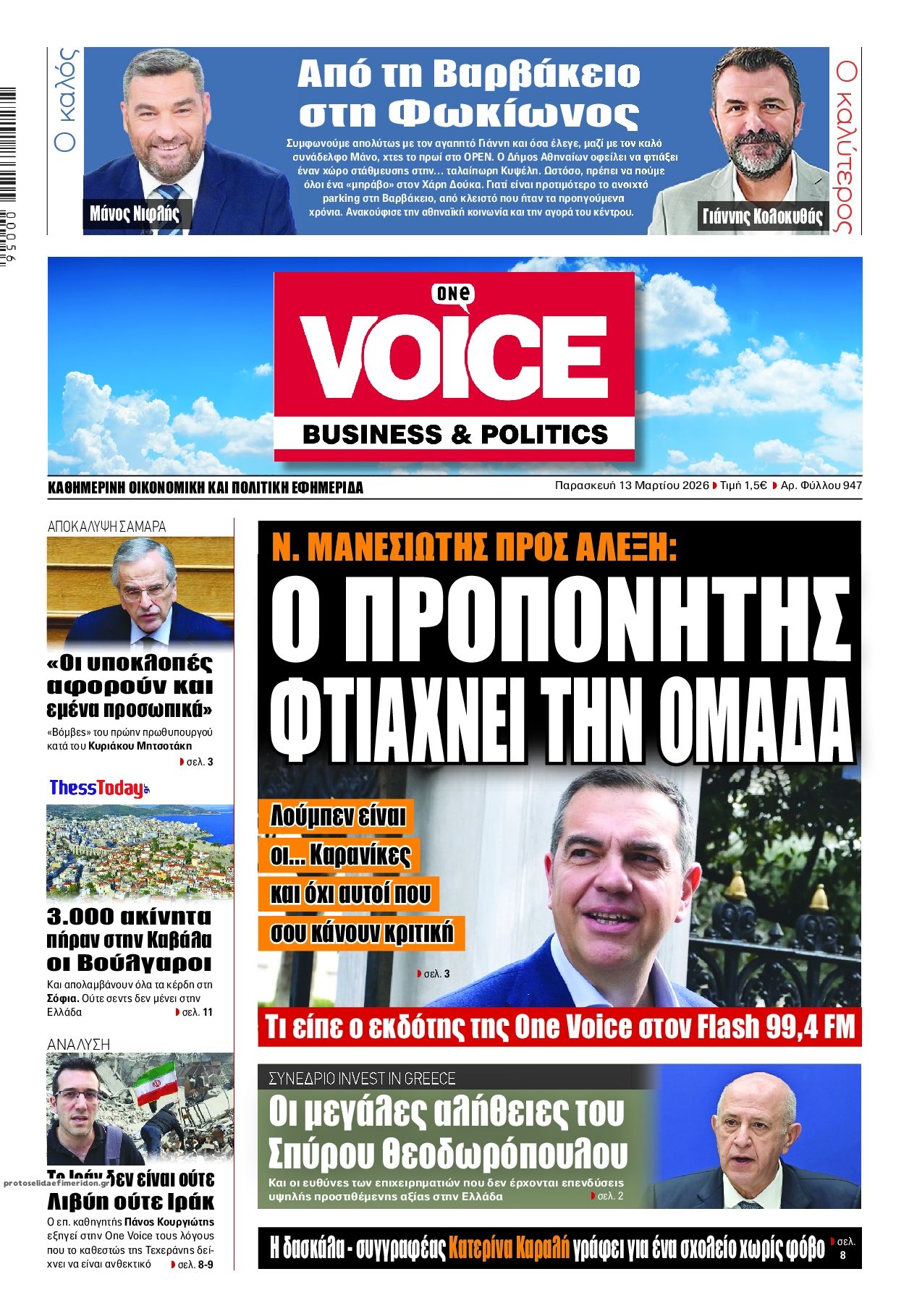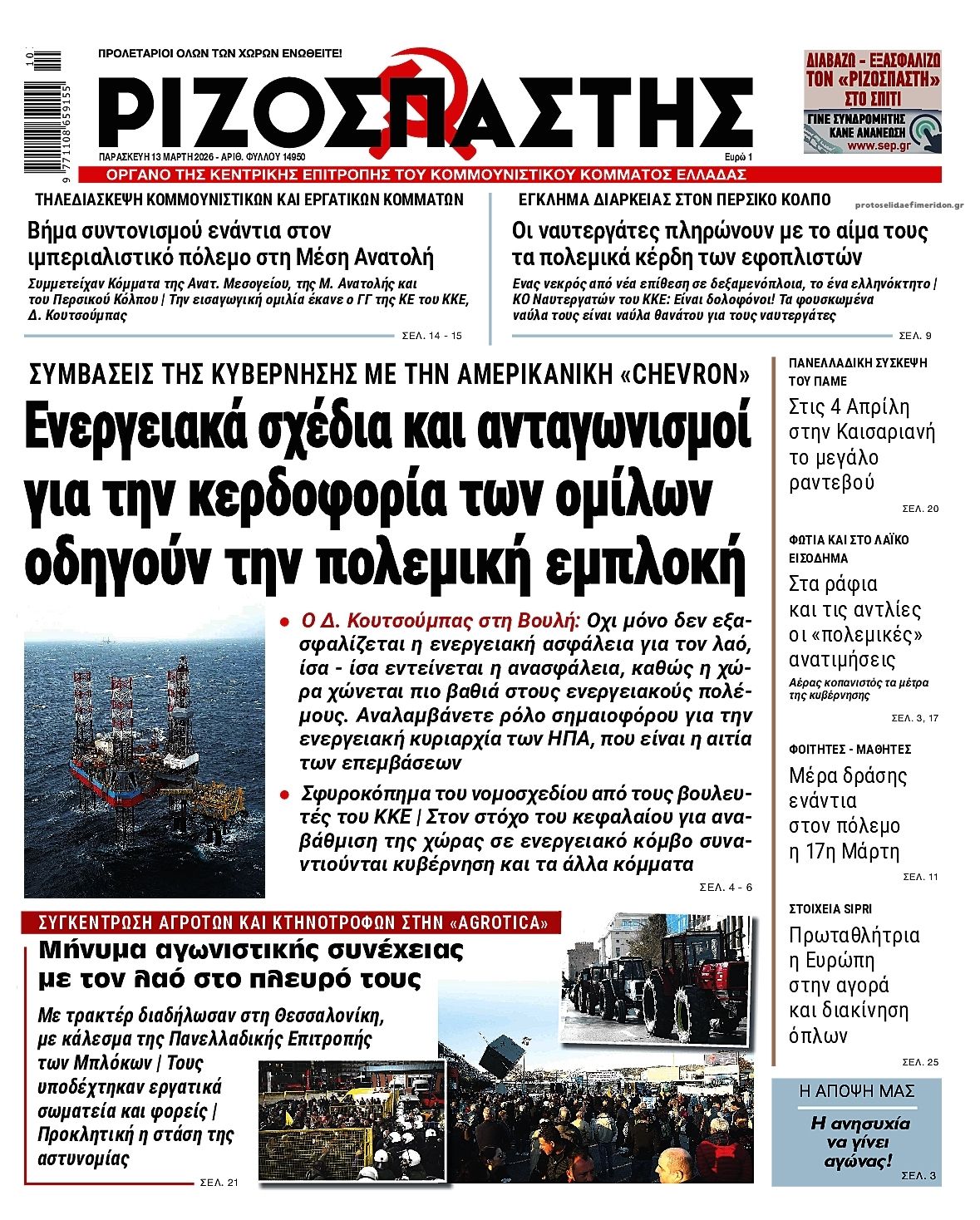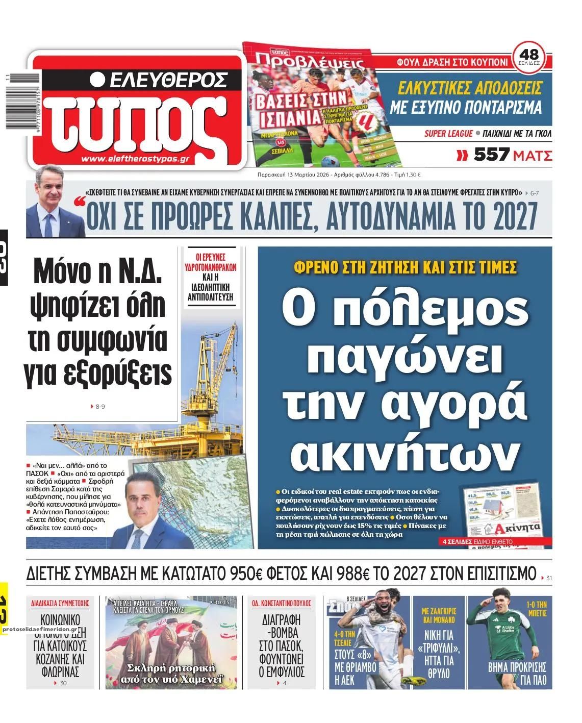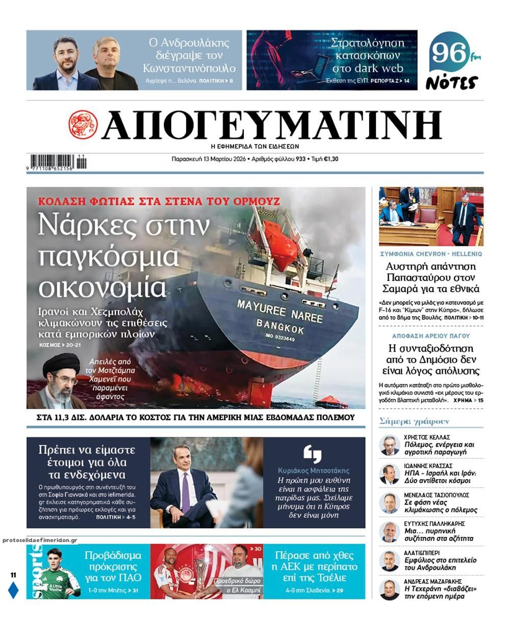 Οι πολιτικές εφημερίδες 13/3/2026 Γιωργος Λαμπρόπουλος 05:38, Παρασκευή 13 Μαρτίου 2026 Media Διαβάστε τα πρωτοσέλιδα από τις πολιτικές εφημερίδες, σήμερα 13/3/2026. ΕΦΗΜΕΡΙΔΕΣ ΠΟΛΙΤΙΚΕΣ ΕΦΗΜΕΡΙΔΕΣ ΠΡΩΤΟΣΕΛΙΔΑ Μοιράσου το: Οι ΗΠΑ έδωσαν προσωρινή άδεια για πώληση ρωσικού πετρελαίου Financial Times: Οι ΗΠΑ εξάντλησαν σημαντικά αποθέματα όπλων στον πόλεμο με το Ιράν Η Ισλαμική Αντίσταση στο Ιράκ ανέλαβε την ευθύνη για την κατάρριψη του αμερικανικού στρατιωτικού αεροσκάφους σχολίασε κι εσύ (0 σχόλια) Ακολουθήστε το enikos.gr στο Google News και μάθετε πρώτοι όλες τις ειδήσεις Δείτε όλες τις τελευταίες ειδήσεις από την Ελλάδα και τον Κόσμο στο enikos.gr Ειδήσεις Ροή Ειδήσεων 23 ώρες πριν LIVE – 13η ημέρα πολέμου ΗΠΑ – Ισραήλ με Ιράν – Οι εξελίξεις 8 ώρες πριν Τραμπ: Γιατί δεν έχει εύκολες λύσεις για τον τερματισμό του πολέμου – Τα λάθη, η υποτίμηση του αντιπάλου και η κόλαση στο Ορμούζ 8 ώρες πριν Οδυσσέας Κωνσταντινόπουλος: Η πρώτη αντίδραση για τη διαγραφή του – «Το τελευταίο καταφύγιο μιας φοβικής ηγεσίας» 9 ώρες πριν Κατασκοπεία στη Σούδα: Βρέθηκαν φωτογραφίες πολεμικών πλοίων στο κινητό του Πολωνού – Αρνείται τις κατηγορίες ο ίδιος 10 ώρες πριν Παναθηναϊκός – Μπέτις 1-0: Μεγάλη νίκη και προβάδισμα για την πρόκριση 58 λεπτά πριν Οπτική ψευδαίσθηση: Μόνο αν είσαι ο Σέρλοκ Χολμς θα βρεις την λεοπάρδαλη σε 15 δευτερόλεπτα 1 ώρα πριν Έλλειψη βιταμίνης D: Πώς συνδέεται με τη χρόνια φλεγμονή, σύμφωνα με νέα μελέτη 4 ώρες πριν Ζώδια 13/3: Ημερήσιες προβλέψεις – Κριοί, φτιάχνετε κάτι που θα κρατήσει 9 ώρες πριν Παγκόσμια Ημέρα Ύπνου 2026: 5 απλές συνήθειες που θα σας βοηθήσουν να κοιμάστε καλύτερα 48 λεπτά πριν Αυτή την Κυριακή με τη Realnews: «Στις μυστικές υπηρεσίες της Μαρίας Αντουανέτας – Τα διαμάντια του θανάτου» – Μυστικά και ίντριγκες στα ανάκτορα των Βερσαλλιών – Από τον συγγραφέα Frédéric Lenormand 2 λεπτά πριν Οι αθλητικές μεταδόσεις της Παρασκευής 13/3/2026 – Παναθηναϊκός-Ολυμπιακός, Euroleague & Ποδόσφαιρο 13 λεπτά πριν Την Κυριακή με τη Realnews: Ό,τι και αν αγοράσεις, σκανάρεις και κερδίζεις! 21 λεπτά πριν UNESCO: Καταστροφές σε μνημεία παγκόσμιας πολιτιστικής κληρονομιάς στο Ιράν λόγω του πολέμου 38 λεπτά πριν ΔΕΔΔΗΕ: Διακοπές ρεύματος σήμερα (13/3) στην Αθήνα και σε άλλες 9 περιοχές της Αττικής ENIKOS NETWORK Είστε τόσο παρατηρητικοί ώστε να βρείτε τις 3 διαφορές στην εικόνα με τον ζωγράφο σε 79 δευτερόλεπτα; Το αρωματικό λαχανικό των Νεμεών που μπορεί να βελτιώσει τη χώνευση και να μειώσει τη φλεγμονή Πώς θα εφαρμοστεί το πλαφόν στα τρόφιμα – Αναλυτικά παραδείγματα Στουρνάρας: Στα επίπεδα του 2025 η ανάπτυξη αν η κρίση στη Μέση Ανατολή κρατήσει ένα μήνα Ευπάθεια στο moltbook ai αποκαλύπτει email, tokens σύνδεσης και api keys Αυτός είναι ο ρόλος της μικρής τρύπας στους νυχοκόπτες – «Είμαι ο μόνος που δεν το ήξερε;»» περισσότερα 07:11 , Παρασκευή 13 Μαρτίου 2026 Οι αθλητικές μεταδόσεις της Παρασκευής 13/3/2026 – Παναθηναϊκός-Ολυμπιακός, Euroleague & Ποδόσφαιρο Το ματς Παναθηναϊκός – Ολυμπιακός για τη Volley League Ανδρών, τα παιχνίδια της Ευρωλίγκας και... 20:42 , Πέμπτη 12 Μαρτίου 2026 Μπαμπά, σ’ αγαπώ: Τι θα κάνουν τα «τρία μπαμπαδάκια» όταν η ζωή θα τους δώσει… λεμόνια; Στο νέο επεισόδιο της οικογενειακής σειράς του Alpha «Μπαμπά, σ’ αγαπώ» απόψε στις 21:00... 12:13 , Πέμπτη 12 Μαρτίου 2026 Ακούστε την εκπομπή του Νίκου Χατζηνικολάου 12/3/2026 Ακούστε την εκπομπή του Νίκου Χατζηνικολάου στον ραδιοφωνικό σταθμό RealFm 97,8, την Πέμπτη 12... ΤΕΛΕΥΤΑΙΕΣ ΕΙΔΗΣΕΙΣ 13 λεπτά πριν Την Κυ