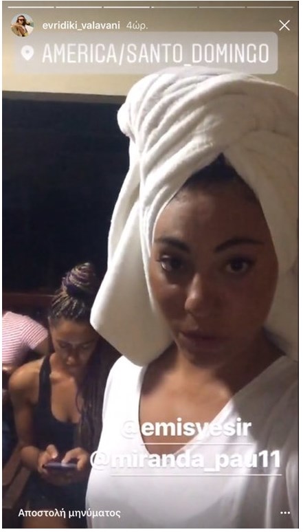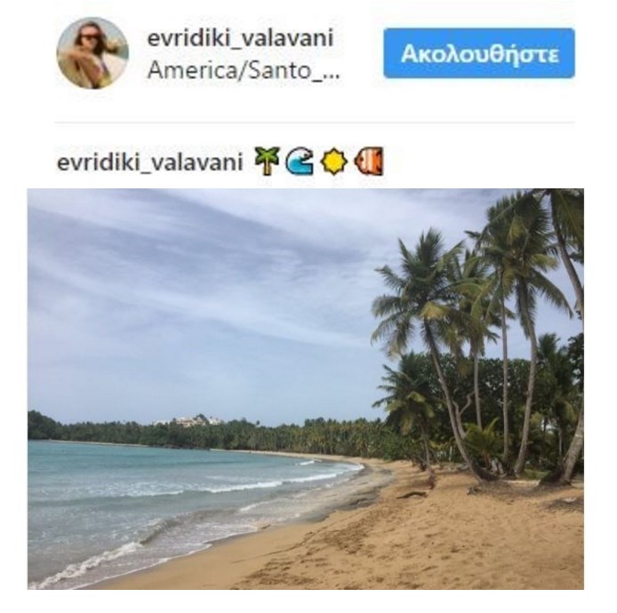 Η αθλητικογράφος βρίσκεται ακόμα στον Άγιο Δομίνικο και απολαμβάνει τις ομορφιές του νησιού. Μάλιστα ανέβασε μια εικόνα από μία πανέμορφη παραλία του νησιού της Καραϊβικής, αλλά και videos στα instastories.