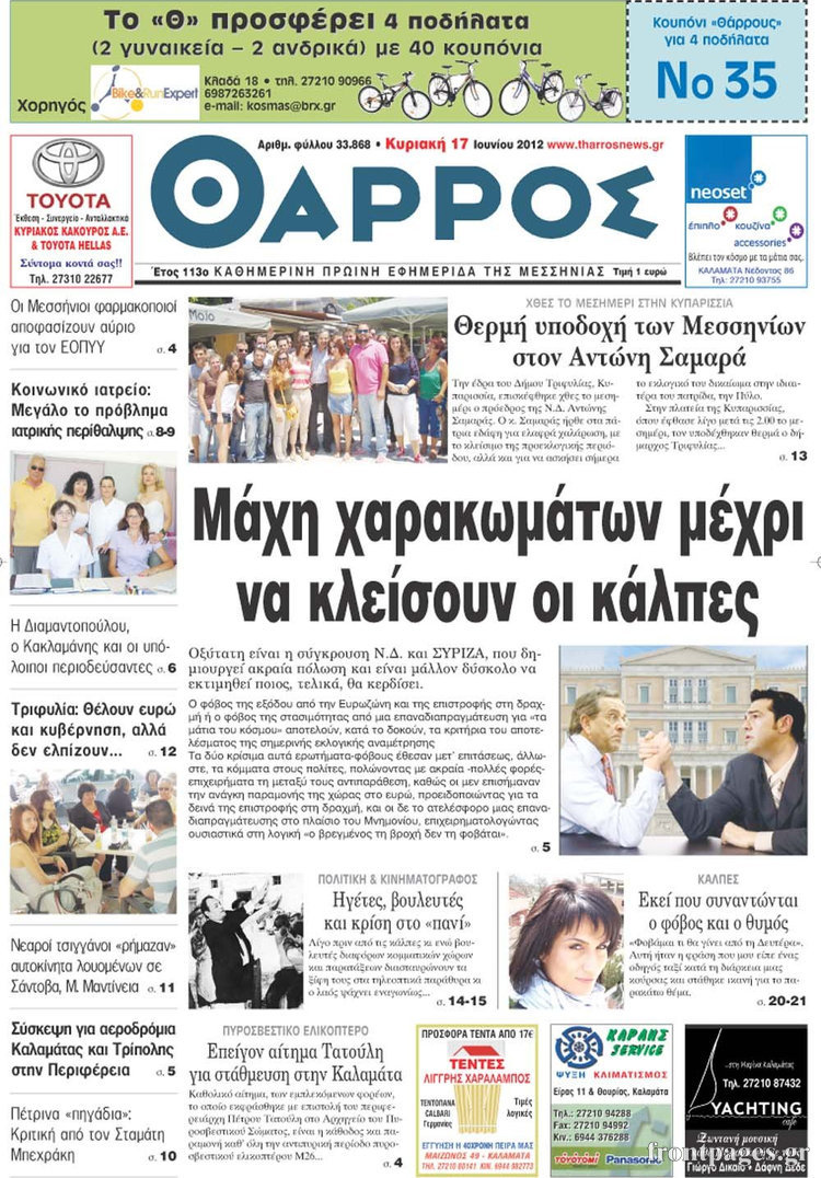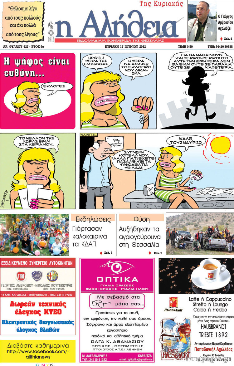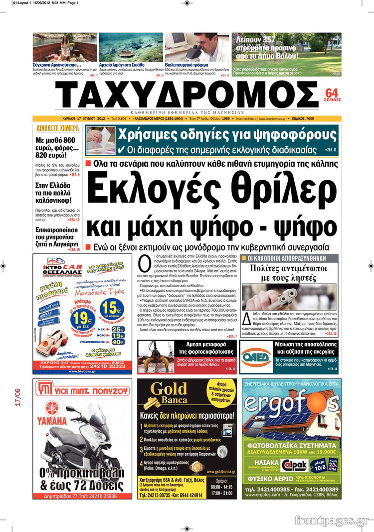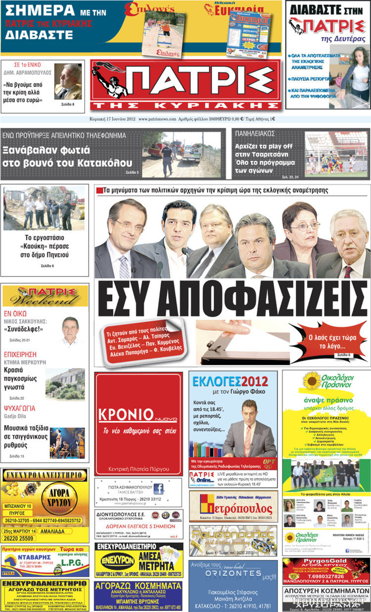Οι τοπικές εφημερίδες Enikos Newsroom 09:59, Κυριακή 17 Ιουνίου 2012 Media ΕΦΗΜΕΡΙΔΕΣ Μοιράσου το: σχολίασε κι εσύ (0 σχόλια) Ακολουθήστε το enikos.gr στο Google News και μάθετε πρώτοι όλες τις ειδήσεις Δείτε όλες τις τελευταίες ειδήσεις από την Ελλάδα και τον Κόσμο στο enikos.gr Ειδήσεις Ροή Ειδήσεων 45 λεπτά πριν Ευρωπαϊκή Ένωση: Χωρίς συμφωνία, για την μακροπρόθεσμη χρηματοδότηση της Ουκρανίας, ολοκληρώθηκε η Σύνοδος Κορυφής στις Βρυξέλλες 4 ώρες πριν ΟΠΕΚΕΠΕ: Προφυλακιστέος ο φερόμενος αρχηγός και ο λογιστής της εγκληματικής οργάνωσης 5 ώρες πριν Αυξάνουν την πίεση προς την κυβέρνηση οι αγρότες: Κλείνουν παρακαμπτήριους και ανοίγουν διόδια – Τι θα γίνει τις γιορτές 5 ώρες πριν Φοινικούντα: Το Σάββατο απολογείται ο 30χρονος γιος γνωστού επιχειρηματία της Πλάκας που παραδόθηκε – Όσα είπε στους αστυνομικούς και ο ρόλος του στο έγκλημα 4 ώρες πριν ΑΕΚ – Κραϊόβα 3-2: Επική ανατροπή και πρόκριση στους «16» του Conference League η Ένωση 5 ώρες πριν Αρχαιολόγοι ανακάλυψαν ρωμαϊκά τεχνουργήματα από μια πόλη που δεν υπήρξε ποτέ – Τα τρία εντυπωσιακά κτίρια και ο αμφορέας με τις… σαρδέλες 6 ώρες πριν Ύπνος: Η απλή βραδινή ρουτίνα για να προστατεύσετε τα μαλλιά σας από το κρύο κατά τη διάρκεια του χειμώνα 7 ώρες πριν Manifesting: Πώς να συναντήσετε τον σύντροφο της ζωής σας, ανάλογα με τον μήνα γέννησής σας 2 ημέρες πριν 20 χρόνια τα Χριστούγεννα ξεκινούν στα Public με μεγάλη ποικιλία σε δώρα! 29 δευτερόλεπτα πριν Στη Φλόριντα σήμερα οι διαβουλεύσεις σχετικά με τα επόμενα στάδια για τη Λωρίδα της Γάζας 5 λεπτά πριν Σίσσυ Τουμάση: «Είμαι ασθενοφοβική πάρα πολύ και με πιάνει μια παράνοια μ’ αυτό» 29 λεπτά πριν Ντόναλντ Τραμπ: Δεν χρειάζομαι την έγκριση του Κογκρέσου για να διατάξω στρατιωτικά πλήγματα στη Βενεζουέλα 45 λεπτά πριν Ευρωπαϊκή Ένωση: Χωρίς συμφωνία, για την μακροπρόθεσμη χρηματοδότηση της Ουκρανίας, ολοκληρώθηκε η Σύνοδος Κορυφής στις Βρυξέλλες 60 λεπτά πριν GNTM: «Κλείδωσαν» οι τέσσερις φιναλίστ – Μεγάλη ανατροπή στις τελευταίες αποχωρήσεις ENIKOS NETWORK Σε περίοδο αυξημένης δραστηριότητας η γρίπη στην Ελλάδα-Μέτρα προστασίας από τον ΕΟΔΥ Σκέφτεστε συνέχεια συζητήσεις που έχετε κάνει; Τι σημαίνει αυτό, σύμφωνα με ειδικό Στεγαστικό: Τι λέει η ΠΟΜΙΔΑ για τα νέα μέτρα που ανακοίνωσε ο Κυριάκος Μητσοτάκης Λαγκάρντ: Αισιόδοξη για την ανάπτυξη της Ευρωζώνης, αβέβαιη για τον πληθωρισμό Χαρτογραφώντας το «σημείο χωρίς επιστροφή»: Για πρώτη φορά αποκαλύπτεται με λεπτομέρεια το ακανθώδες όριο της ατμόσφαιρας τ... Η Google καταργεί τη λειτουργία «dark web report» – Πώς θα μπορούν οι χρήστες να διαγράφουν τα δεδομένα τους περισσότερα 02:50 , Παρασκευή 19 Δεκεμβρίου 2025 GNTM: «Κλείδωσαν» οι τέσσερις φιναλίστ – Μεγάλη ανατροπή στις τελευταίες αποχωρήσεις Για προτελευταία φορά εμφανίστηκαν στο πλατό του GNTM οι φιναλίστ του φετινού κύκλου, το βράδυ... 17:45 , Πέμπτη 18 Δεκεμβρίου 2025 ROUK ZOUK: Εορταστικό επεισόδιο με καλεσμένους τους πρωταγωνιστές του «Γιατί ρε πατέρα» Το Σάββατο 20 Δεκεμβρίου στις 21:00, η Ζέτα Μακρυπούλια υποδέχεται εκλεκτούς ηθοποιούς που όλο... 17:20 , Πέμπτη 18 Δεκεμβρίου 2025 Άγιος έρωτας: Η Χριστίνα εξομολογείται στον πατέρα Νικόλαο, απόψε στις 21:00 στον Alpha Η Νότα αποφασίζει να εκδικηθεί τον Πέτρο και τον Στέφανο, για χάρη του Λούη, όμως τα πράγματα ... 16:50 , Πέμπτη 18 Δεκεμβρίου 2025 Να μ’ αγαπάς: Ζωή και Φωτεινή συμφιλιώνονται ως μάνα με κόρη, απόψε στις 20:00 Η ταυτότητα του Άγγελου αποκαλύπτεται στο νέο επεισόδιο της 