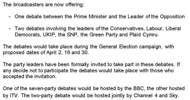 Σε αντίθεση με ότι συνέβη στη χώρα μας, το BBC, το ITV, το Channel 4 και το Sky έχουν προτείνει τρεις συζητήσεις πριν από τις εκλογές του Μαΐου, μεταξύ των ηγετών των πολιτικών κομμάτων. Προτείνουν τη μορφή 7-7-2, δηλαδή, δύο συζητήσεις μεταξύ των μεγαλύτερων επτά κομμάτων και ένα μεταξύ της κυβέρνησης και της αντιπολίτευσης.