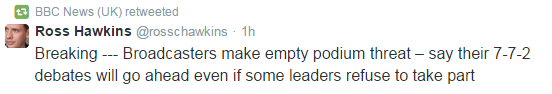 Οι ραδιοτηλεοπτικοί φορείς ξεκαθαρίζουν ότι θα είναι ντροπιαστικό για όποιον δεν θελήσει να συμμετάσχει στις συζητήσεις. Ο πολιτικός αναλυτής του BBC ανάρτησε ένα τουίτερ όπου ξεκαθαρίζει ότι η θέση όποιου δεν αποδεχθεί την πρόσκληση θα μείνει κενή.