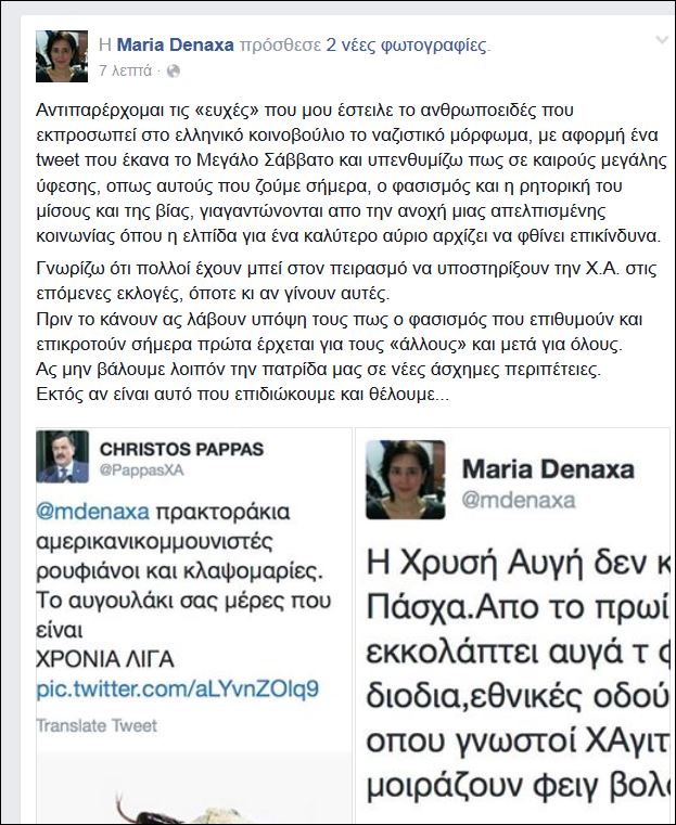 «Αντιπαρέρχομαι τις «ευχές» που μου έστειλε το ανθρωποειδές που εκπροσωπεί στο ελληνικό κοινοβούλιο το ναζιστικό μόρφωμα, με αφορμή ένα tweet που έκανα το Mεγάλο Σάββατο και υπενθυμίζω πως σε καιρούς μεγάλης ύφεσης, όπως αυτούς που ζούμε σήμερα, ο φασισμός και η ρητορική του μίσους και της βίας, γιγαντώνονται από την ανοχή μιας απελπισμένης κοινωνίας όπου η ελπίδα για ένα καλύτερο αύριο αρχίζει να φθίνει επικίνδυνα.