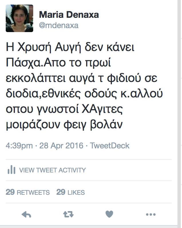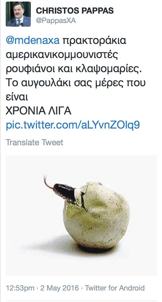 Ο βουλευτής της Χρυσής Αυγής απάντησε με αυτό τον χυδαίο τρόπο σε ένα tweet της Μαρίας Δεναξά, στο οποίο είχε γράψει: «Η Χρυσή Αυγή δεν κάνει Πάσχα. Από το πρωί εκκολάπτει αυγά του φιδιού σε διόδια, εθνικές οδούς και αλλού, όπου γνωστοί Χρυσαυγίτες μοιράζουν φέιγ βολάν».