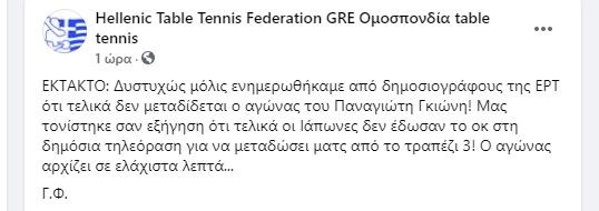 “Δυστυχώς μόλις ενημερωθήκαμε από δημοσιογράφους της ΕΡΤ ότι τελικά δεν μεταδίδεται ο αγώνας του Παναγιώτη Γκιώνη! Μας τονίστηκε σαν εξήγηση ότι τελικά οι Ιάπωνες δεν έδωσαν το οκ στη δημόσια τηλεόραση για να μεταδώσει ματς από το τραπέζι 3! Ο αγώνας αρχίζει σε ελάχιστα λεπτά…” ανέφερε σε ανάρτησή της στο Facebook η ελληνική ομοσπονδία επιτραπέζιας αντισφαίρισης.