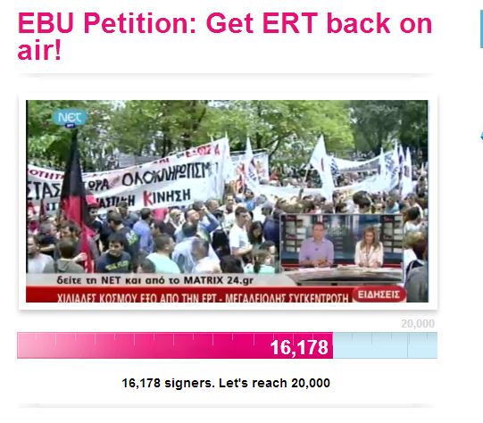 H EBU, όχι μόνο έχει εκφράσει την αντίθεσή της στο κλείσιμο της ΕΡΤ αλλά συγκεντρώνει και υπογραφές με σκοπό να μην σιωπήσει η κρατική τηλεόραση. Μέχρι αυτή τη στιγμή, οι υπογραφές έχουν ξεπεράσει τις 16 χιλιάδες και ο στόχος είναι να ξεπεράσει τις 20 χιλιάδες.