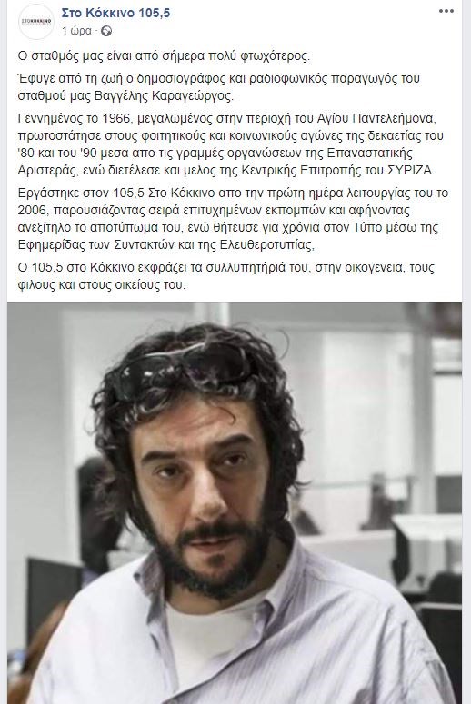 Την τελευταία του πνοή άφησε σε ηλικία 53 ετών ο δημοσιογράφος Βαγγέλης Καραγεώργος. Η είδηση του θανάτου έγινε γνωστή από την σελίδα στο Facebook του ραδιοφωνικού σταθμού “στο Κόκκινο”, όπου εργαζόταν. Επίσης είχε συνεργαστεί με την Εφημερίδα των Συντακτών και την Ελευθεροτυπία, ενώ είχα διατελέσει και μέλος της Κεντρικής Επιτροπής του ΣΥΡΙΖΑ.