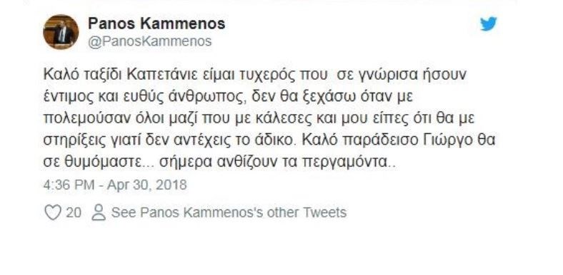 «Καλό ταξίδι Καπετάνιε είμαι τυχερός που σε γνώρισα ήσουν έντιμος και ευθύς άνθρωπος, δεν θα ξεχάσω όταν με πολεμούσαν όλοι μαζί που με κάλεσες και μου είπες ότι θα με στηρίξεις γιατί δεν αντέχεις το άδικο. Καλό παράδεισο Γιώργο θα σε θυμόμαστε… σήμερα ανθίζουν τα περγαμόντα…»