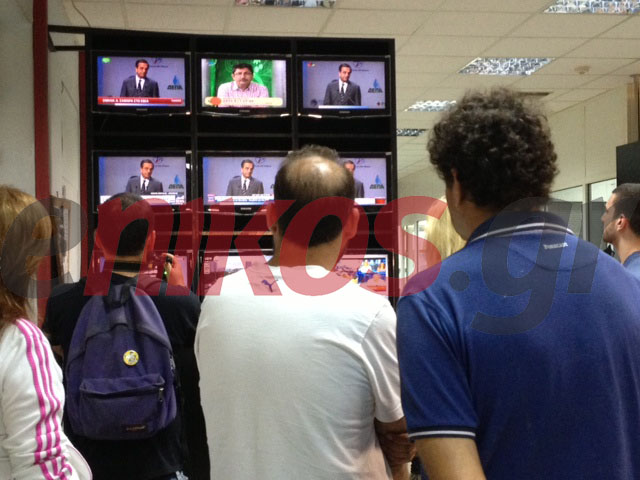 Με μεγάλη αγωνία εργαζόμενοι της ΕΡΤ παρακολουθούν στην αίθουσα σύνταξης την ομιλία του πρωθυπουργού Αντώνη Σαμαρά στον ΕΒΕΑ. Οι εργαζόμενοι αγωνιούν για το μέλλον τους μετά τις τελευταίες δραματικές εξελίξεις στη δημόσια τηλεόραση.