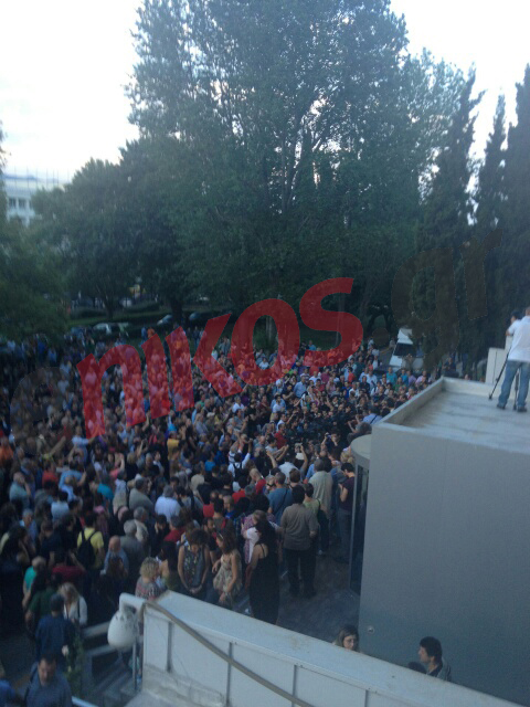 Πλήθος κόσμου βρίσκεται αυτή την ώρα στο προαύλιο της ΕΡΤ, φωνάζοντας συνθήματα για το κλείσιμο της δημόσιας τηλεόρασης.