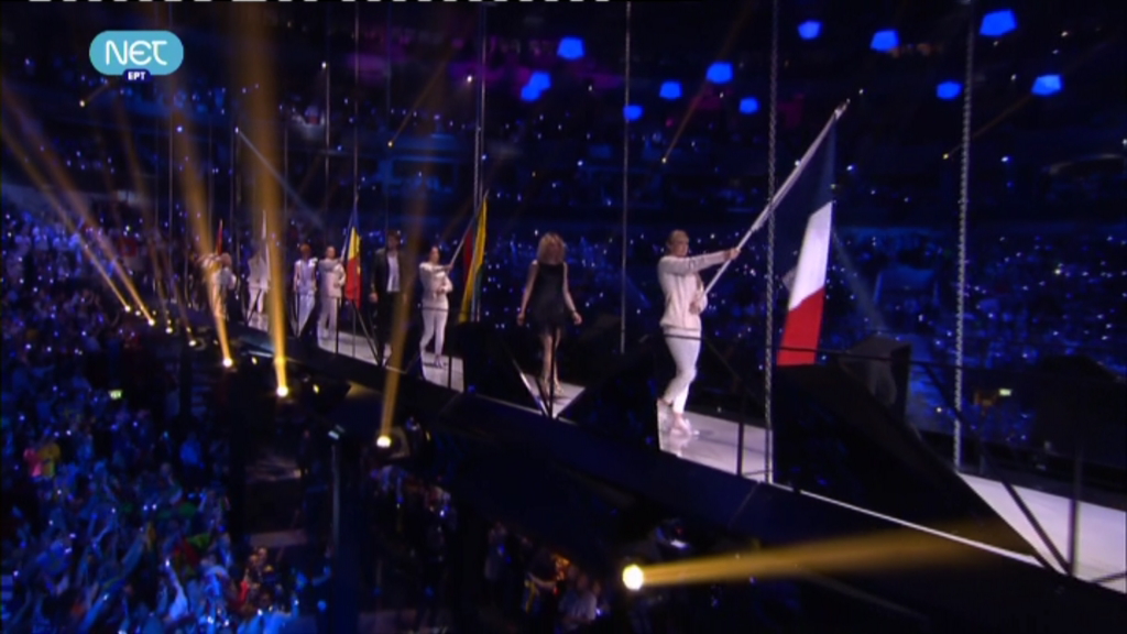H έναρξη του αποψινού τελικού της Eurovision είναι πρωτότυπη και εντυπωσιακή! Για πρώτη φορά, όλοι οι συμμετέχοντες παρελαύνουν μπροστά από το κοινό και διασχίζουν την εκπληκτική αυτή γέφυρα του σκηνικού.