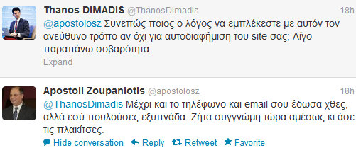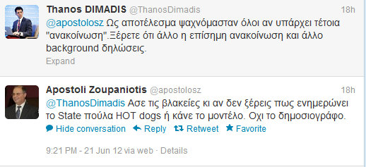 Όλα ξεκίνησαν στις 20 Ιουνίου, όταν ο ανταποκριτής του Mega στην Αμερική, ο Μιχάλης Ιγνατίου, μετέδωσε μέσω του κεντρικού δελτίου ειδήσεων, ότι ο Πρόεδρος της Αμερικής Obama περιμένει να συναντήσει τον Έλληνα Πρωθυπουργό, Αντώνη Σαμαρά.Ο ανταποκριτής του ΣΚΑΪ, όμως είχε διαφορετική άποψη, διαψεύδοντας ότι υπάρχει τέτοια πληροφορία. Αυτό είχε σαν αποτέλεσμα, να ξεσπάσει ένας ζωηρός καυγάς στο twitter, στον οποίο πήρε μέρος και ο γνωστός δημοσιογράφος – εκδότης του ομογενειακού τύπου, Απόστολος Ζουπανιώτης…Σας παραθέτουμε μερικά αποσπάσματα από τον διάλογό τους…