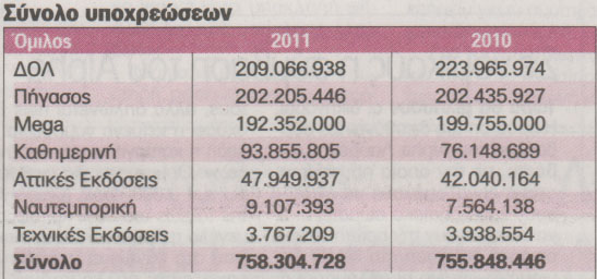 Στο απίστευτο ύψος των 758.304.728 ευρώ παραμένουν οι υποχρεώσεις ομίλων ΜΜΕ, χωρίς να περιλαμβάνονται το Alter και η X. Tεγόπουλος. Οι υποχρεώσεις των ΜΜΕ αυξήθηκαν το 2011 κατά 2. εκατ. ευρώ σε σχέση με το 2010, που έφτασαν τα 755.848.446 ευρώ.Το εντυπωσιακό στοιχείο είναι πως τις μεγαλύτερες υποχρεώσεις έχουν οι ισχυροί όμιλοι ΜΜΕ (ΔΟΛ, Πήγασος Mega) με 603 εκατ. ευρώ.Τις υψηλότερες υποχρεώσεις για το 2011 είχε ο ΔΟΛ με 209 εκατ. ευρώ. Ακολουθούν ο Πήγασος με 202. εκατ. ευρώ, ο Τηλέτυπος με 192 εκατ. ευρώ και η Καθημερινή με 93.855.805 ευρώ. Με μικρότερες υποχρεώσεις οι Αττικές Εκδόσεις, στα 47 εκατ. ευρώ. Στα 9 εκατ. ευρώ η Ναυτεμπορική και με 3,7 οι Τεχνικές Εκδόσεις. Αυτός είναι ο πίνακας με τις οικονομικές υποχρεώσεις των παραπάνω συγκροτημάτων που δημοσιεύει η εφημερίδα ΠΑΡΟΝ: