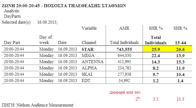 Σύμφωνα με τις μετρήσεις της Nielsen, για την κοινή ζώνη μετάδοσης δελτίων ειδήσεων, μεταξύ 20.00-20.45, τη Δευτέρα 16.9.2013, οι ειδήσεις του Star σημείωσαν 25,9% ποσοστό τηλεθέασης στο σύνολο και 26,6% στο κοινό 15-44.