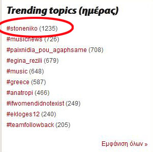 Πρώτο trend στο twitter, στην Ελλάδα, για χτες το #stoneniko σύμφωνα με το site trending.gr
