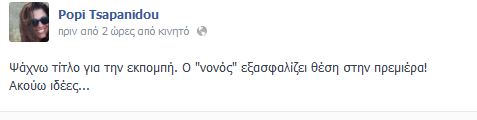 Η Πόπη Τσαπανίδου ψάχνει τίτλο για την εκπομπή που θα παρουσιάζει την νέα σεζόν στο Star όπως έγραψε στην προσωπική της σελίδα στο Facebook.