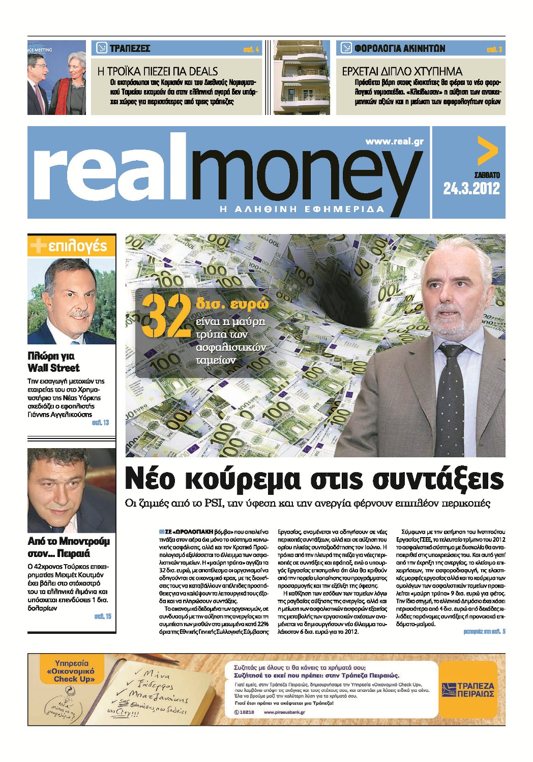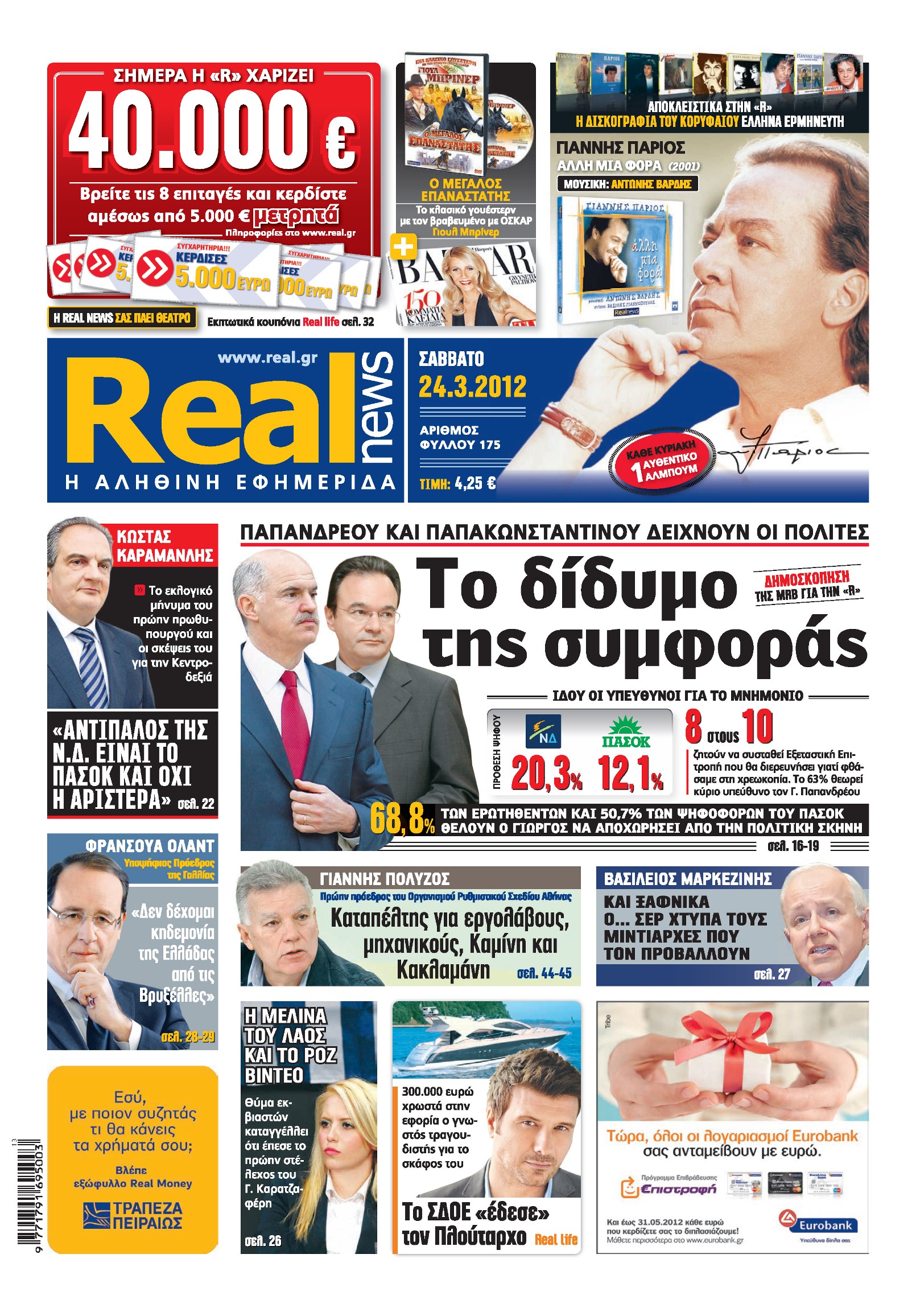 “Το δίδυμο της συμφοράς” είναι ο κεντρικός τίτλος της Real News, που κυκλοφορεί εκτάκτως σήμερα.Μεταξύ πολλών άλλων θεμάτων, θα βρείτε και μεγάλη αποκλειστική δημοσκόπηση της MRB. Σύμφωνα με τη δημοσκόπηση, οι πολίτες “δείχνουν” Παπανδρέου και Παπακωνσταντίνου, ως υπεύθυνους για το Μνημόνιο! Οκτώ στους δέκα πολίτες ζητούν να συσταθεί Εξεταστική Επιτροπή που θα διερευνήσει γιατί φθάσαμε στη χρεωκοπία.Το 63% θεωρεί κύριο υπεύθυνο τον Παπανδρέου, ενώ το 68,8% των ερωτηθέντων και το 50,7% των ψηφοφόρων του ΠΑΣΟΚ θέλουν ο πρώην πρωθυπουργός να αποχωρήσει από την πολιτική σκηνή!Στο πολιτικό «μήνυμα» της δημοσκόπησης αναφέρεται το κύριο άρθρο της εφημερίδας και του Νίκου Χατζηνικολάου με τίτλο: “Ερχεται ανατροπή!”.