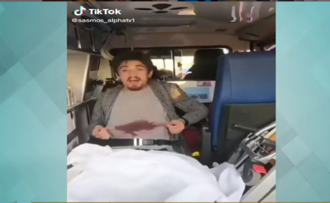 Στο βίντεο που έχει “σπάσει” το TikTok φαίνεται ο τηλεοπτικός Πετρής να “αναστένεται” πάνω στο ασθενοφόρο. Ο Κώστας Νικούλι δείχνει μάλιστα το “τραύμα” από τη σφαίρα που του αφαίρεσε τη ζωή.