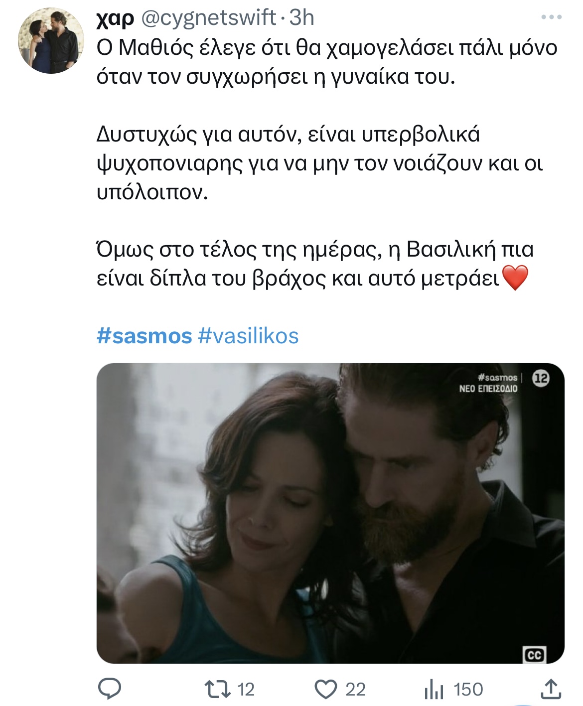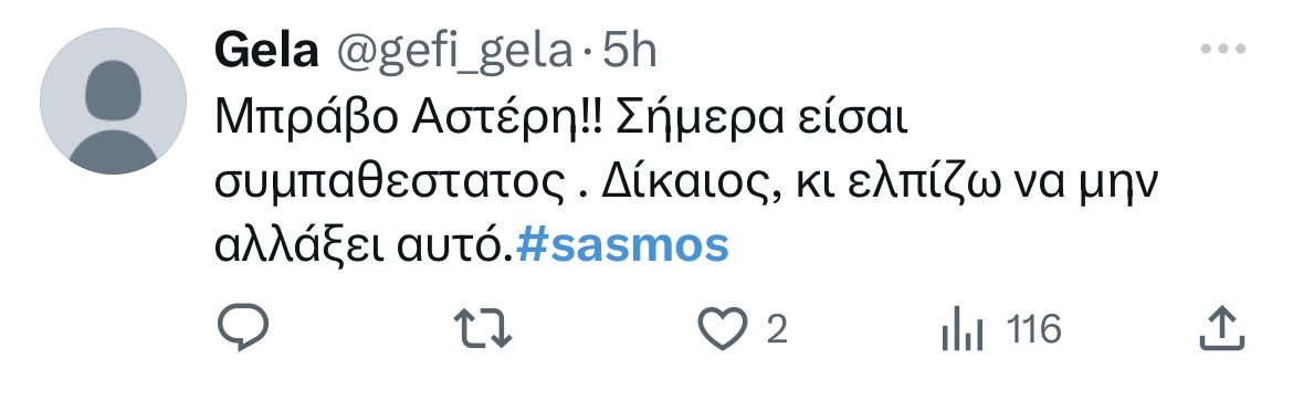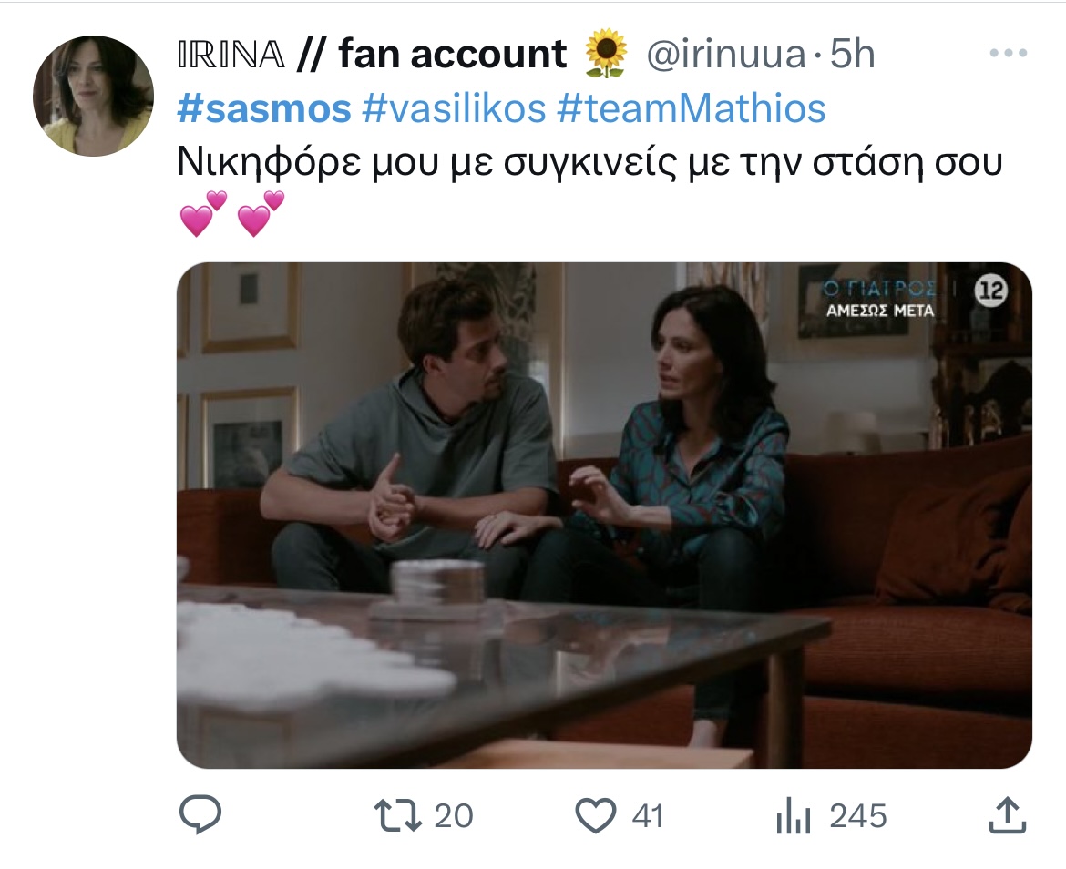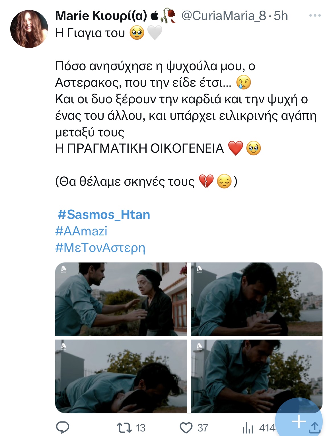 Το Twitter σχολίασε με τον δικό του τρόπο τις εξελίξεις και τις ερμηνείες: «προσκύνησε» την έκρηξη του Αστέρη (Ορφέα Αυγουστίδη) όταν πληροφορήθηκε ότι ο Μαθιός (Δημήτρης Λάλος) είναι ο δολοφόνος του Στεφανή και είπε «μπράβο» για τη στοργή με την οποία αγκάλιασε τη γιαγιά Ειρήνη (Όλγα Δαμάνη).