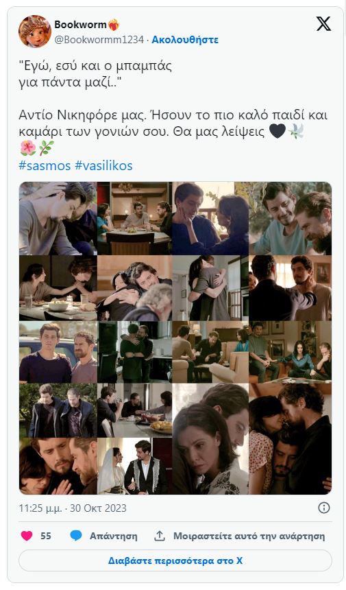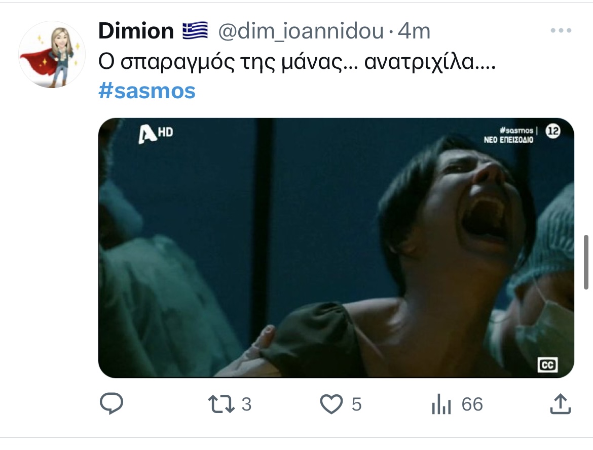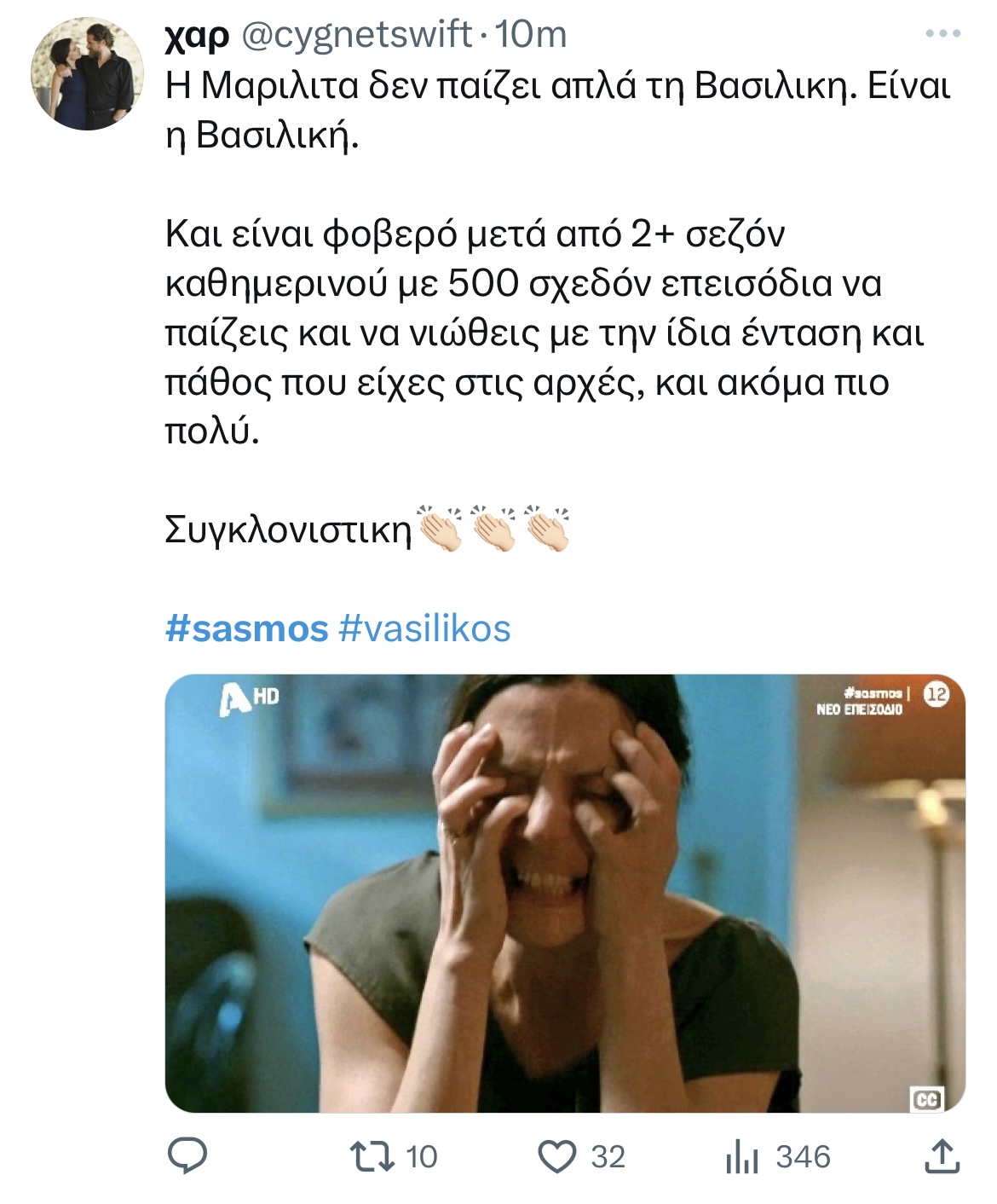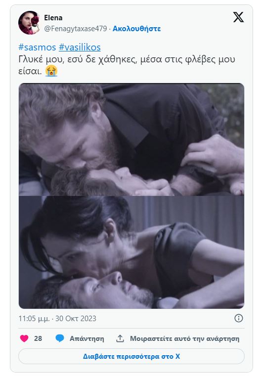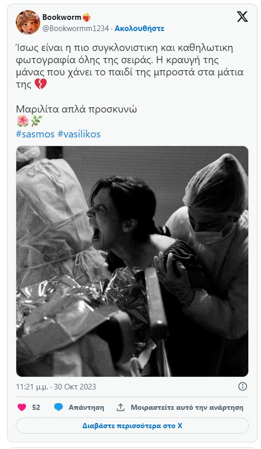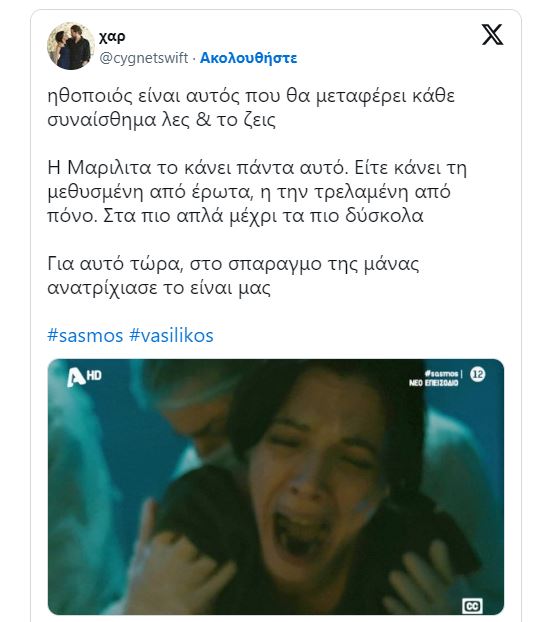 Μια μάσκα πόνου το πρόσωπό της Βασιλικής, δάκρυα οργής και λύπης το καλύπτουν. Mε την ψυχή γεμάτη πένθος και την καρδιά βουτηγμένη στην απόγνωση σπαράζει όταν ο γιος της ξεψυχά στην αγκαλιά της. Κι ύστερα στρέφεται εναντίον της Καλλιόπης (Μαρία Τζομπανάκη) σε ένα ξέσπασμα, μια έκρηξη που έκανε το Twitter X να υποκλιθεί: