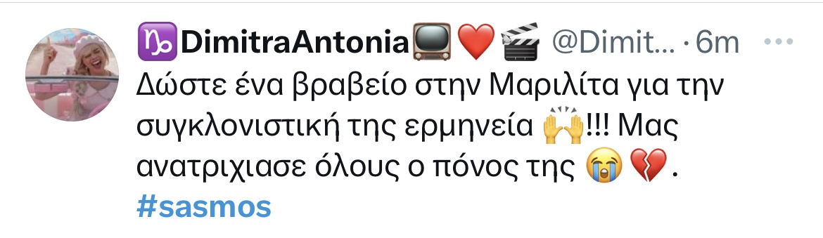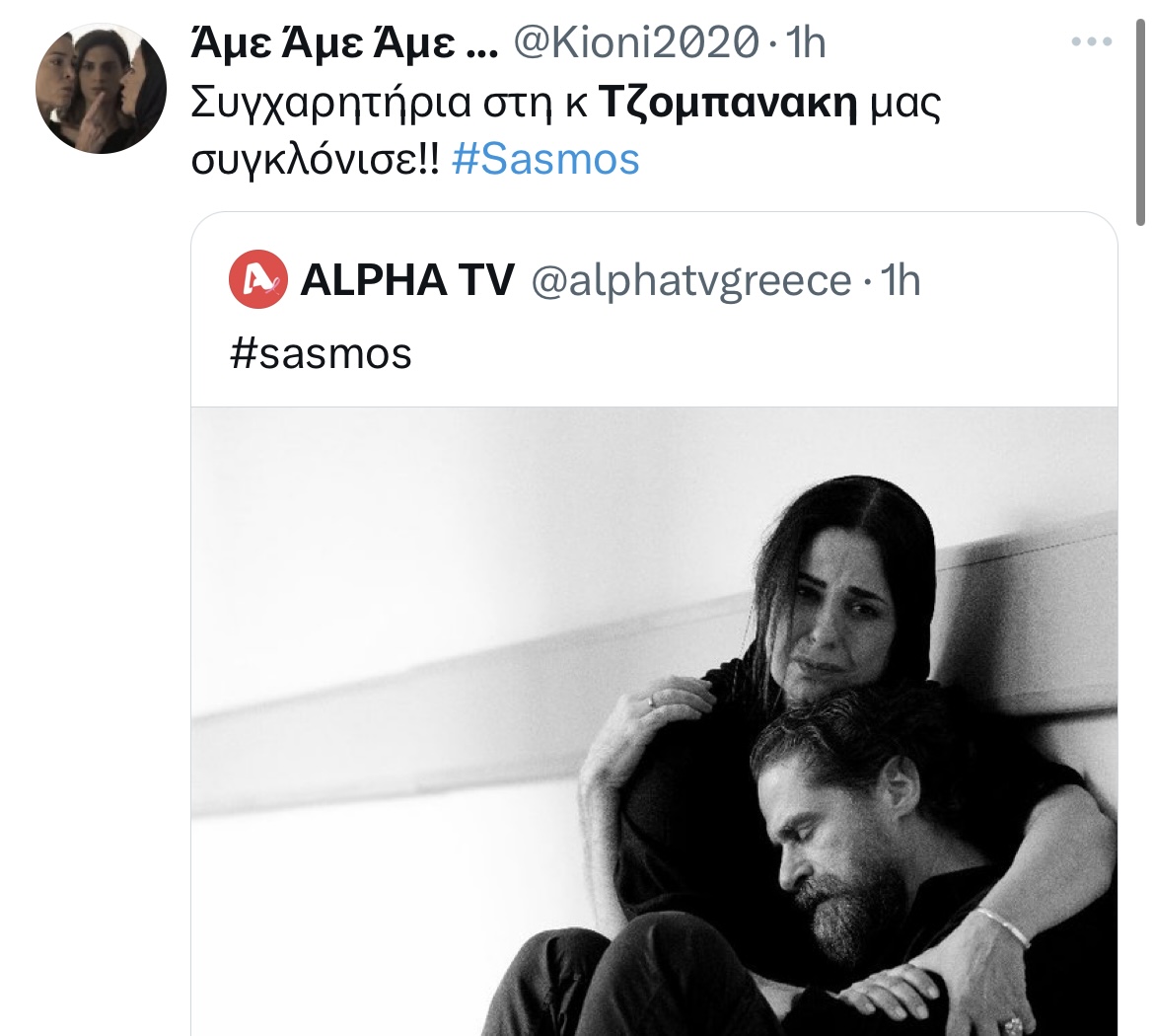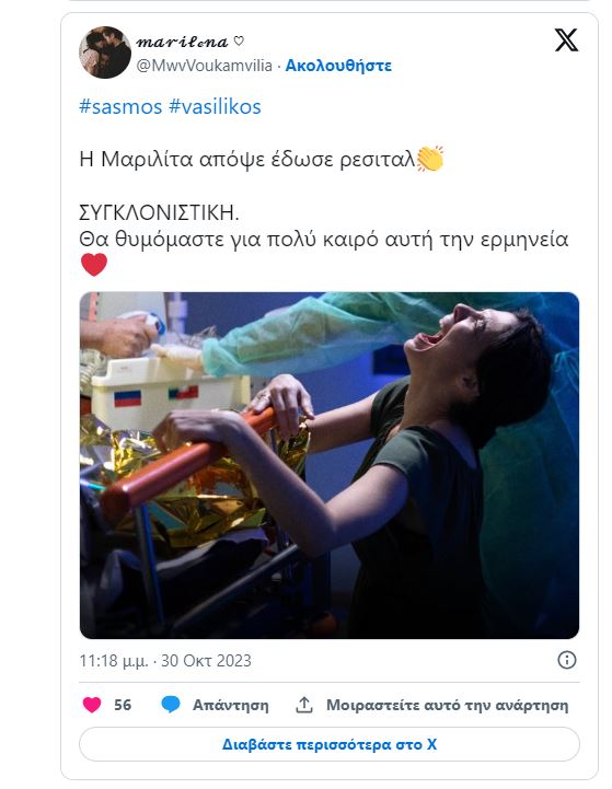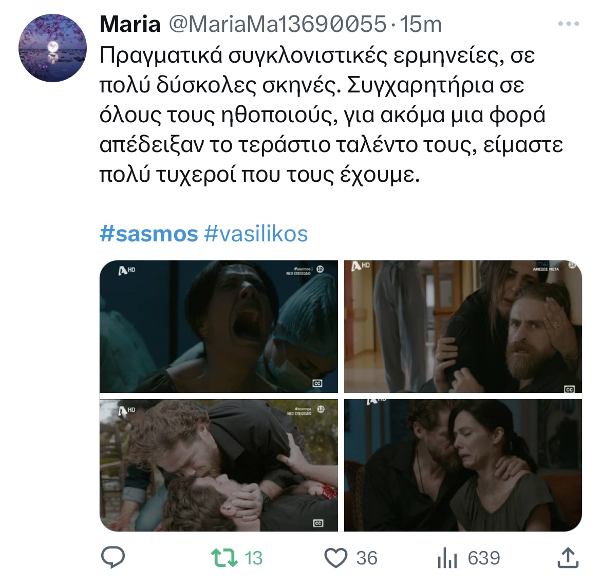 «Πραγματικά συγκλονιστικές ερμηνείες σε πολύ δύσκολες σκηνές. Συγχαρητήρια σε όλους τους ηθοποιούς, για ακόμα μια φορά απέδειξαν το τεράστιο ταλέντο τους, είμαστε τυχεροί που τους έχουμε» συμφωνεί το Twitter X.