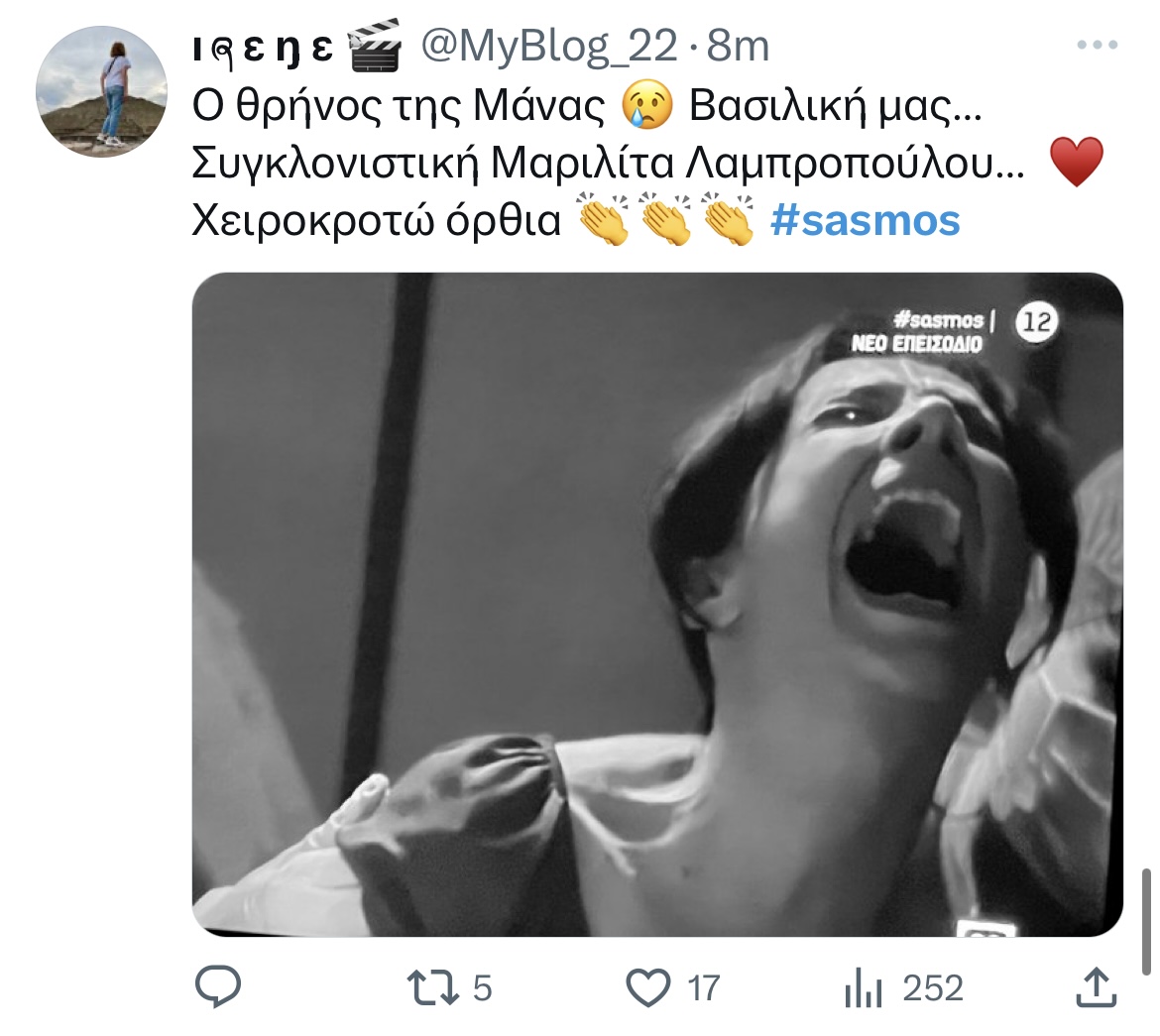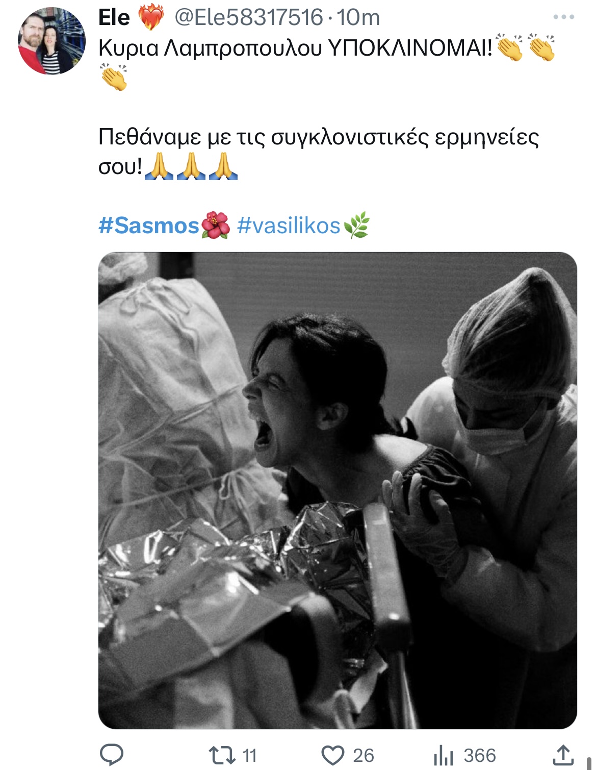 Η εικόνα της Βασιλικής (Μαριλίτα Λαμπροπούλου), ματώνει την καρδιά: «Η Μαριλίτα μας διέλυσε» ομολογεί το Twitter X. Κι αλλού: «Ο θρήνος της Μάνας. Βασιλική μας. Συγκλονιστική Μαριλίτα Λαμπροπούλου. Χειροκροτώ όρθια».