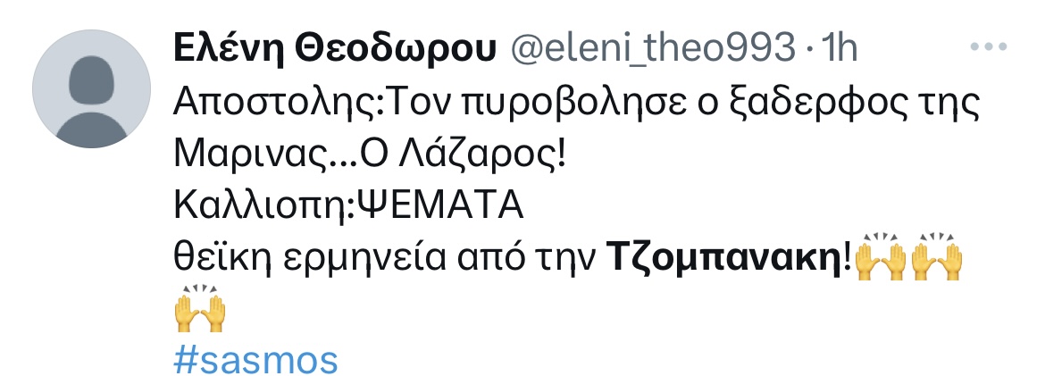 Αλλά και η κραυγή της Καλλιόπης λύγισε και τους πιο ψύχραιμους, ραγίζοντας καρδιές. «Υποκλίνομαι στη Τζομπανάκη». «Θεϊκή ερμηνεία από την Τζομπανάκη» υπογραμμίζει το Twitter X .