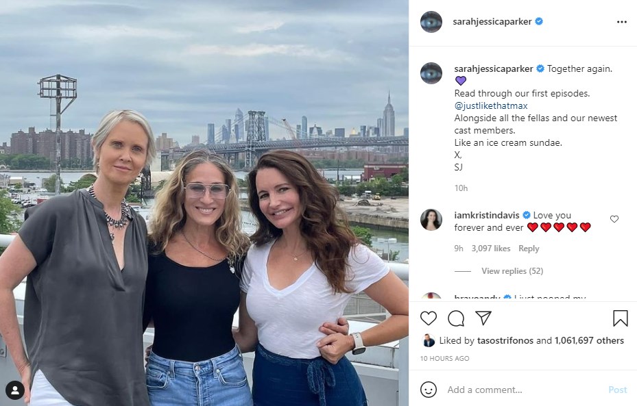 Πρόσφατα ανακοινώθηκε το reboot της επιτυχημένης σειράς του HBO “Sex and the City”. Η σειρά θα προβληθεί στο HBO με τον τίτλο «And Just Like That…». Η Κάρι, η Μιράντα (Σίνθια Νίξον) και η Σάρλοτ (Κρίστιν Ντέιβις) πλέον έχουν περάσει στην πέμπτη δεκαετία της ζωής τους και οι προκλήσεις που αντιμετωπίζουν είναι διαφορετικές. Η Σάρα Τζέσικα Πάρκερ δημοσίευσε την πρώτη φωτογραφία από την συνάντηση με τις συμπρωταγωνίστριές της, καθώς αρχίζουν τα γυρίσματα των πρώτων επεισοδία. “Μαζί ξανά. Διαβάζουμε για τα πρώτα μας επεισόδια. Στο πλάι μας παλιοί φίλοι αλλά και νέα μέλη της ομάδας. Σαν ένα παγωτό…” έγραψε στη λεζάντα.