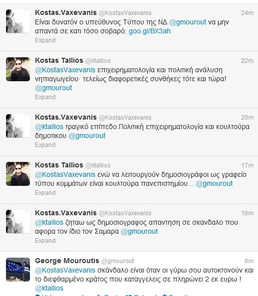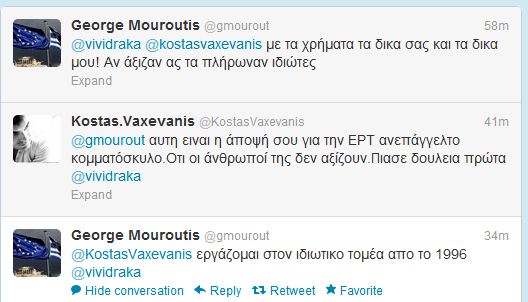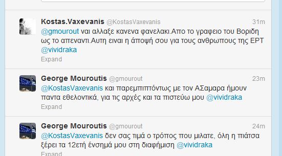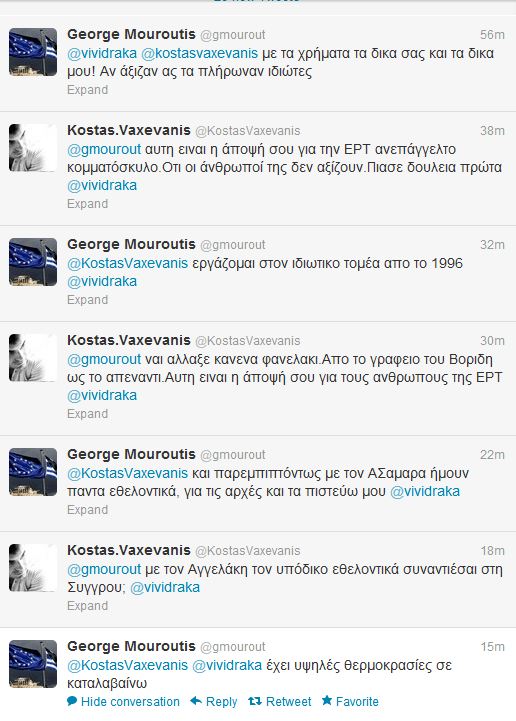 Έντονη αντιπαράθεση με αφορμή την κρατική τηλεόραση στο twitter, είχαν πριν από λίγο ο αναπληρωτής εκπρόσωπος της Νέας Δημοκρατίας και στενός συνεργάτης του Αντώνη Σαμαρά, Γιώργος Μουρούτης με τον γνωστό δημοσιογράφο Κώστα Βαξεβάνη. Διαβάστε ένα απόσπασμα από τον διάλογο