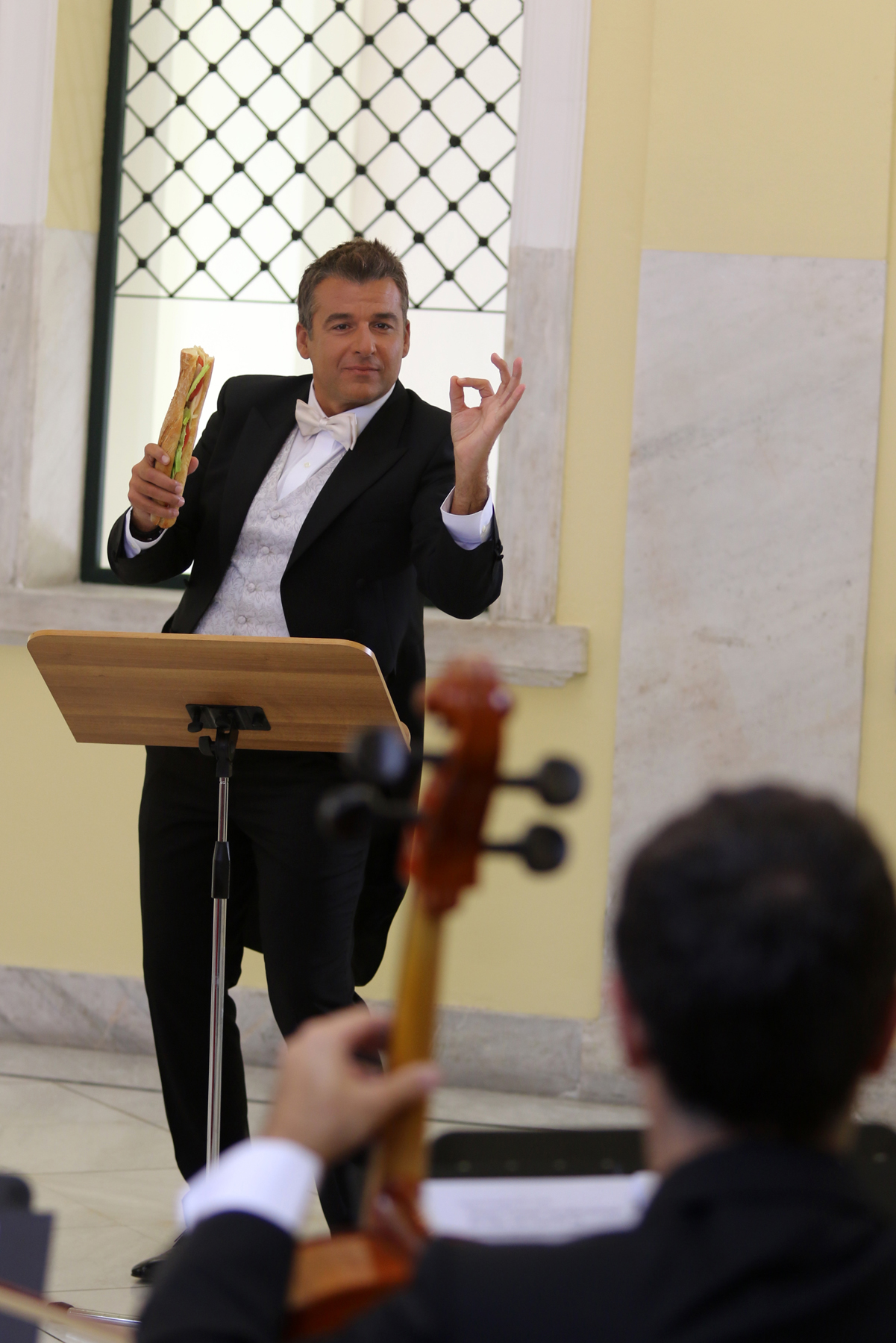 Ο Γιώργος Λιάγκας, ο “μαέστρος” του σχήματος παίρνει τη θέση του και ετοιμάζεται να δώσει το σήμα. Τι θα συμβεί όμως όταν ζητήσει μία μπαγκέτα για να διευθύνει το σχήμα; Τι θα του φέρουν και πώς θα αντιδράσει η Φαίη; Το χιούμορ και η κλασική ανατροπή είναι και πάλι παρόντα! Η μπαγκέτα είναι τελικά σάντουιτς και ο Γιώργος αν και αρχικά σαστισμένος, αποφασίζει να συνεχίσει με αυτό!