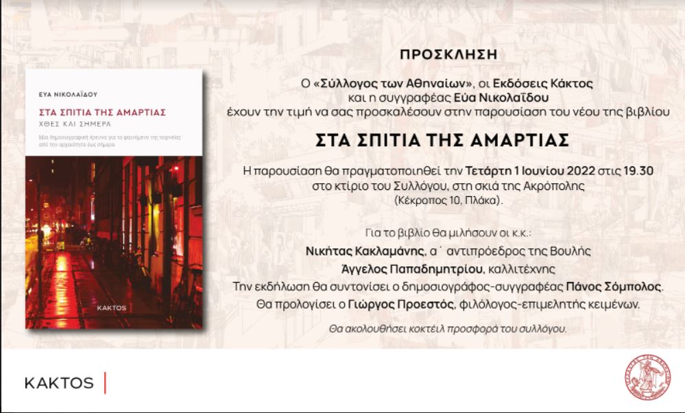 Ο “Σύλλογος των Αθηναίων”, οι Εκδόσεις Κάκτος και η συγγραφέας Εύα Νικολαΐδου διοργανώνουν την παρουσίαση του νέου της βιβλίου “ΣΤΑ ΣΠΙΤΙΑ ΤΗΣ ΑΜΑΡΤΙΑΣ”.