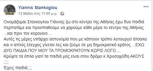 Σε σχετική ανάρτηση στον λογαριασμό του στο facebook, ο πρωταγωνιστής της σειράς “Άγριες Μέλισσες” γράφει εξοργισμένος: “Ονομάζομαι Στάνκογλου Γιάννης, ζω στο κέντρο της Αθήνας έχω δυο παιδιά περπατάμε και προσπαθούμε να χαρούμε κάθε μέρα το κέντρο της Αθήνας …και πριν τον κορονοϊό… Αυτές τις μέρες υπάρχει αστυνομία που με κάποιον τρόπο λειτουργεί άτσαλα και ο απλός έλεγχος γίνεται λες και ζούμε σε μη δημοκρατικό κράτος …ΕΧΩ ΔΥΟ ΠΑΙΔΙΑ ΠΟΥ ΜΟΥ ΤΑ ΤΡΟΜΟΚΡΑΤΟΥΝ ΧΩΡΙΣ ΛΟΓΟ….”.