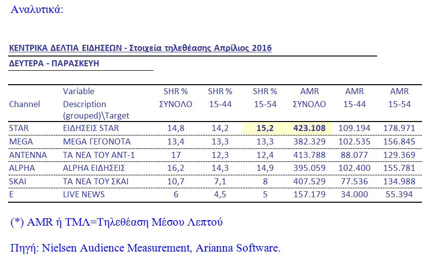 Το κεντρικό δελτίο του Star είχε επίσης τον μεγαλύτερο απόλυτο αριθμό τηλεθεατών και στα εμπορικά κοινά 15-44 ετών και 15-54 ετών (βλ. πίνακα).
