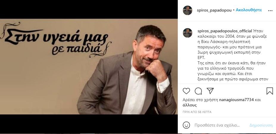 Όπως ανέφερε αναλυτικά στην ανάρτησή του ο Σπύρος Παπαδόπουλος: “Ήταν καλοκαίρι του 2004, όταν με φώναξε η Βίκυ Λάσκαρη-τηλεοπτική παραγωγός- και μου πρότεινε μια 3ωρη ψυχαγωγική εκπομπή στην ΕΡΤ. Της είπα, ότι αν έκανα κάτι, θα ήταν για το ελληνικό τραγούδι που γνωρίζω και αγαπώ. Και έτσι ξεκινήσαμε με πρώτο αφιέρωμα στον αγαπημένο Μάνο Ελευθερίου.