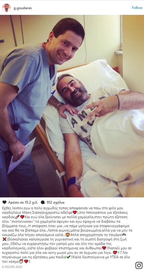 Θέλω να ευχαριστήσω τον γιατρό μου και όλη την ομάδα της καρδιολογικής…είστε όλοι φοβεροί επιστήμονες και άνθρωποι❤️‼️Ναταλί μου σε ευχαριστώ πολύ για όλα και sorry μωρό μου αν σε άγχωσα για λίγο… Υ.Γ.Να πηγαίνουμε για τις εξετάσεις μας παιδιά✔️‼️Καλά Χριστούγεννα με ΥΓΕΙΑ σε όλο τον κόσμο ❤️‼️» έγραψε συγκεκριμένα ο Γρηγόρης Γκουντάρας. Δείτε την ανάρτησή του: