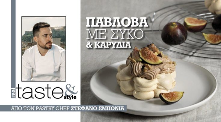 O pastry chef Στέφανος Σμπόνιας δημιουργεί μια πάβλοβα με σύκο και καρύδια, ένα γλυκό γεμάτο φθινοπωρινή θαλπωρή, που τιμά τη λεπτότητα των εποχικών υλικών.