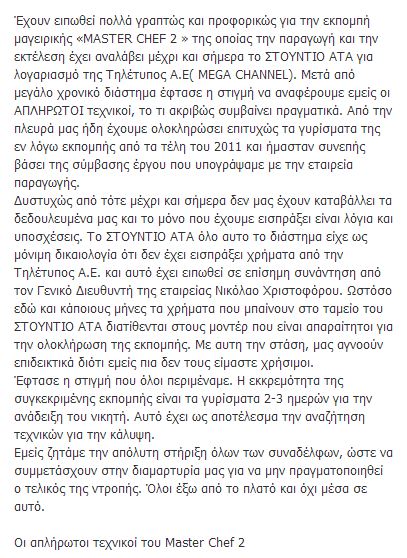 Τα επεισόδια του Master Chef που προβάλλονται κάθε βράδυ από τη συχνότητα του Mega, έχουν γυριστεί εδώ και πολύ καιρό. Το θέμα είναι ότι ο τελικός δεν έχει γυριστεί και οι απλήρωτοι τεχνικοί απειλούν να τον τινάξουν στον αέρα…