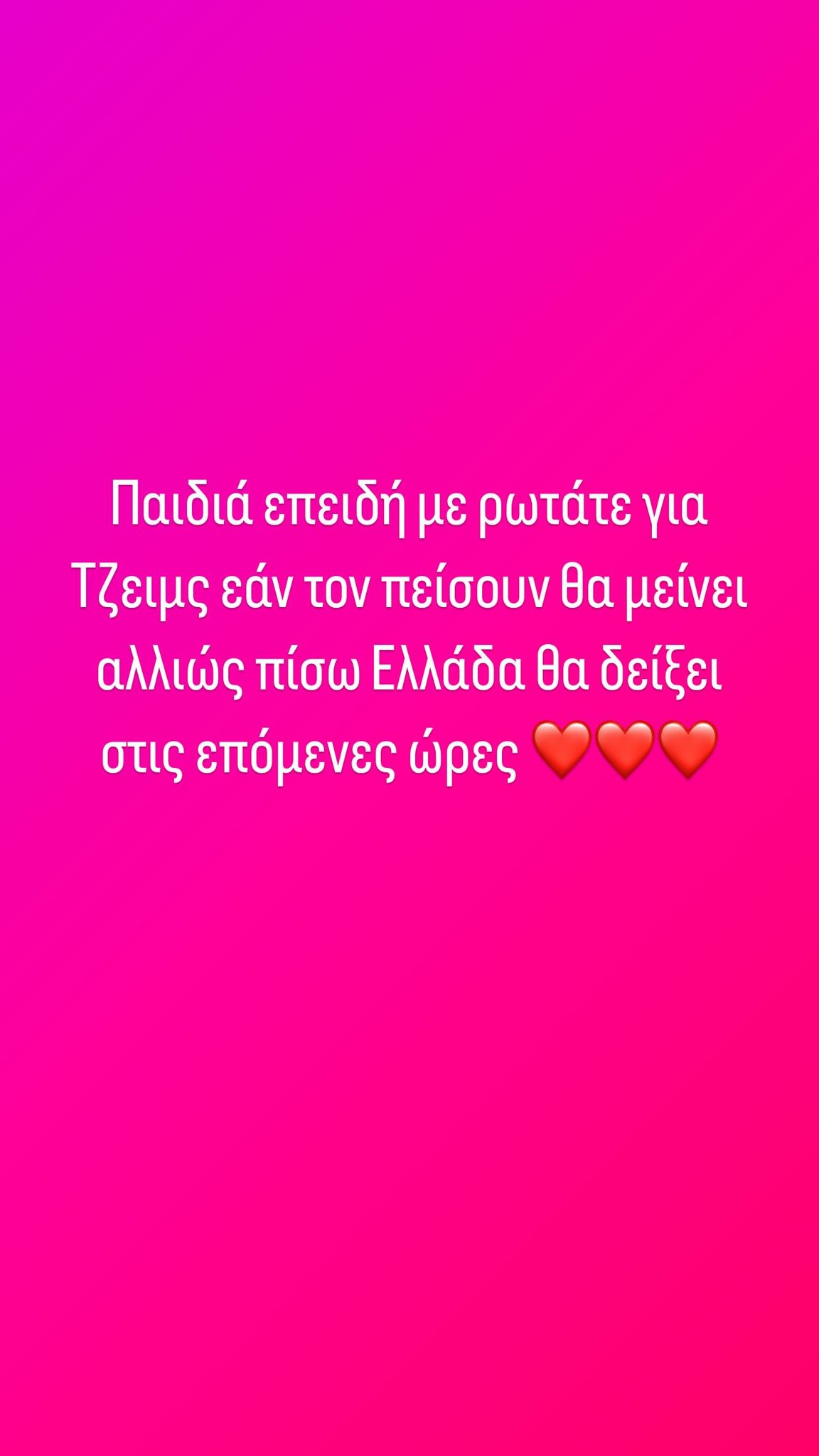 Τέλος, σε ένα τρίτο post που έκανε σε story του, ο τραγουδιστής εξήγησε πως: «Παιδιά επειδή με ρωτάτε για τον James, εάν τον πείσουν θα μείνει, αλλιώς πίσω Ελλάδα. Θα δείξει στις επόμενες ώρες».