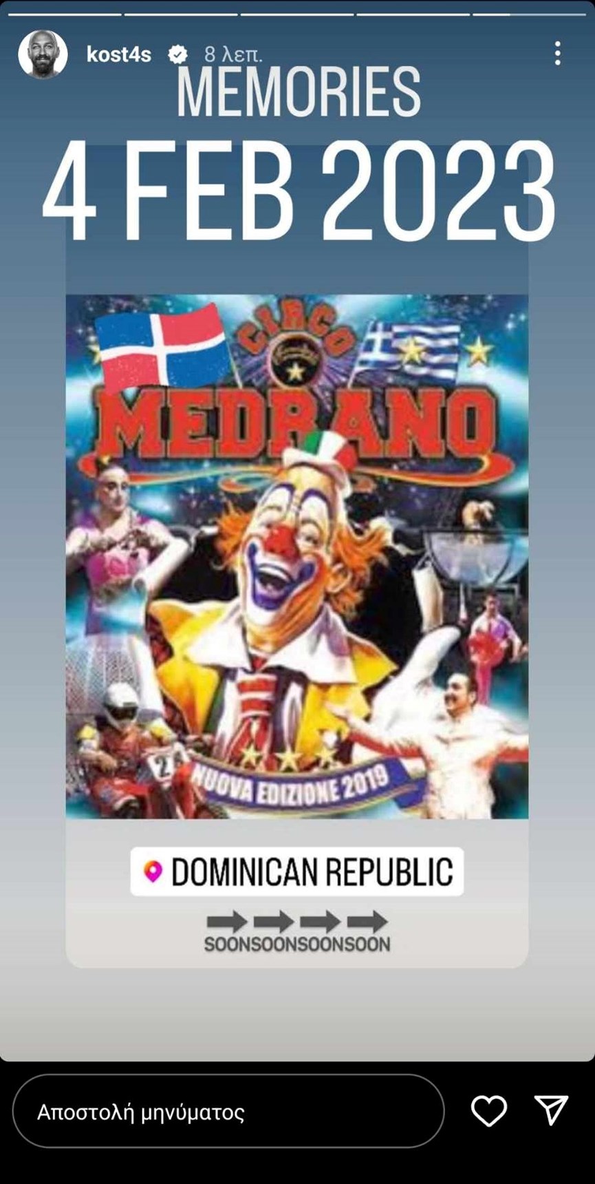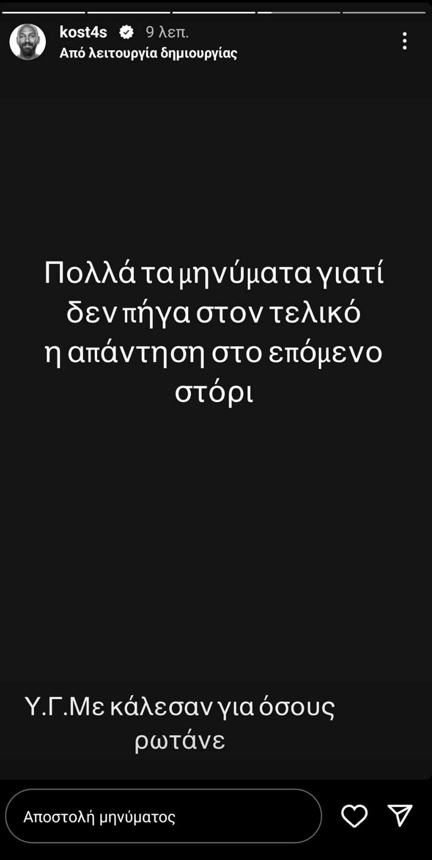 «Πολλά τα μηνύματα γιατί δεν πήγα στον τελικό. Η απάντηση στο επόμενο στόρι. Υ.Γ Με κάλεσαν για όσους ρωτάνε», έγραψε χαρακτηριστικά ο Κώστας Αναγνωστόπουλος στο Instagram, ανεβάζοντας στη συνέχεια μία φωτογραφία από το Τσίρκο Μεντράνο, παραλληλίζοντας το Survivor με αυτό.