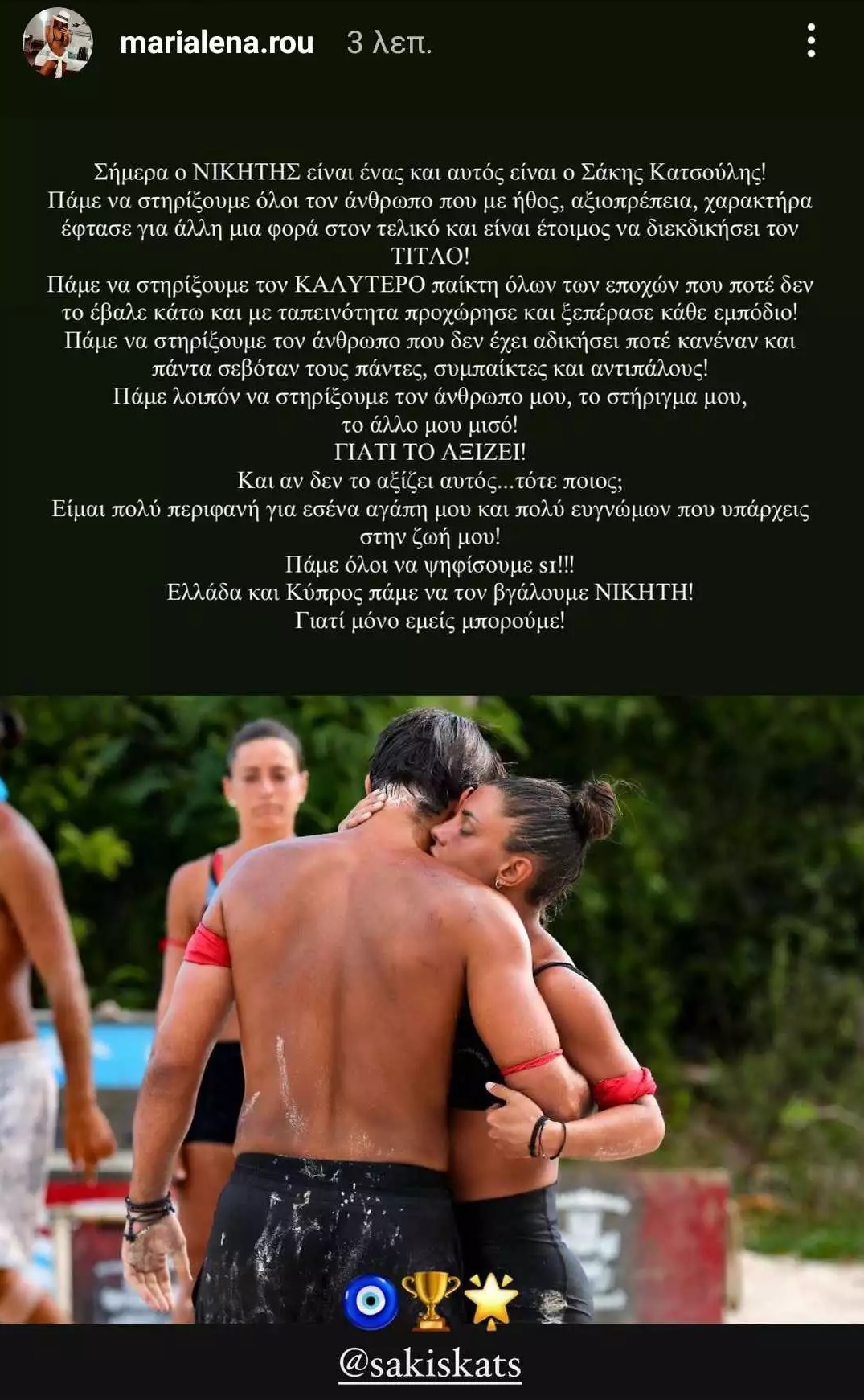 Η Μαριαλένα Ρουμελιώτη που κατέκτησε την τρίτη θέση του ριάλιτι επιβίωσης του ΣΚΑΪ, ανάρτησε ένα μακροσκελές κείμενο στο Instagram, θέλοντας να εκφράσει την στήριξή της στον σύντροφό της, Σάκη Κατσούλη.