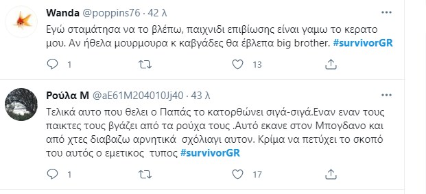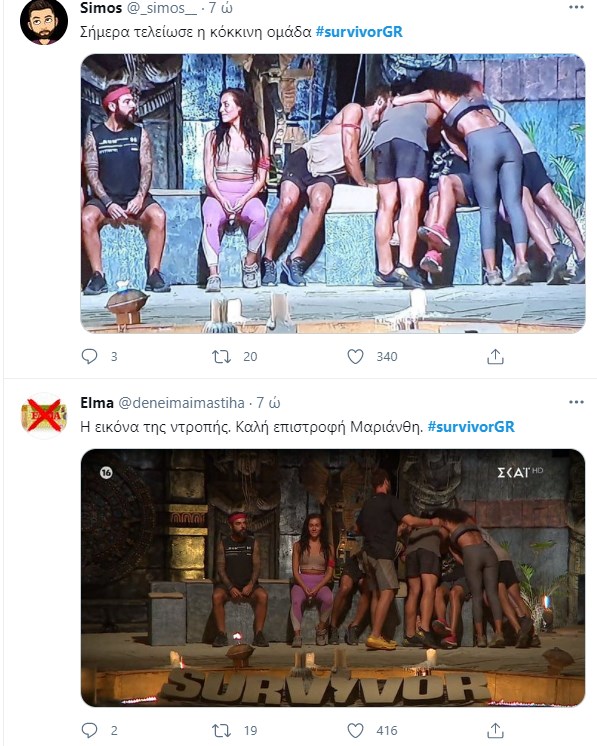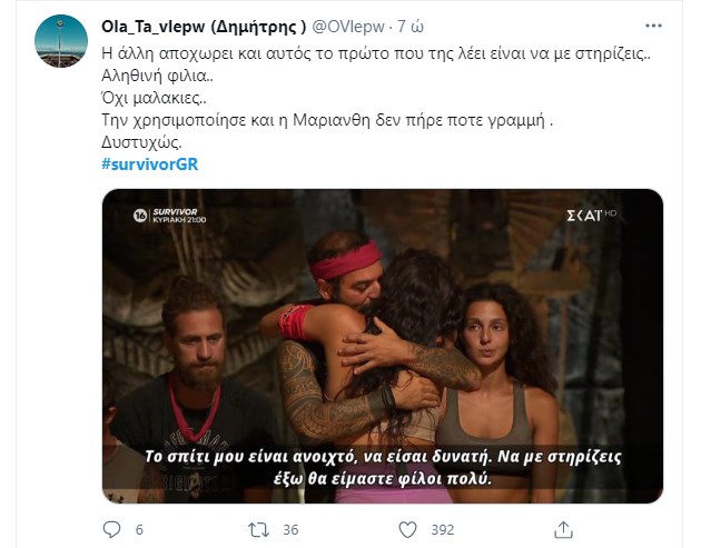Η Μαριάνθη αποχώρησε από το Survivor, μετά το χθεσινό συμβούλιο του νησιού. Ο Τριαντάφυλλος την “γλίτωσε” για άλλη μια φορά, ενώ με την ανακοίνωση από τον Γιώργο Λιανό, όλοι οι παίκτες της ομάδας έσπευσαν να αγκαλιάσουν την Έλενα. Τριαντάφυλλος και Μαριάνθη αντάλλαξαν ένα βλέμμα που τα έλεγε όλα. Οι δύο τους είχαν μια ιδιαίτερη επικοινωνία και είναι οι δύο παίκτες που είχαν καθημερινά εντάσεις και καβγάδες με τους υπολοίπους. Το Twitter ήταν διχασμένο με κάποιους να κατακρίνουν την αγκαλιά των παικτών την ώρα που η Μαριάνθη έπρεπε να αποχωρήσει.