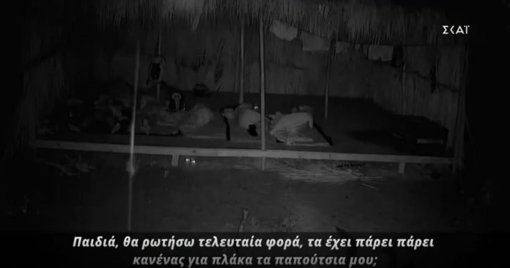 Στην αναζήτηση των παπουτσιών, ο Τάκης άρχισε να εκνευρίζεται και όταν τελικά τα βρήκε στην ακροθαλασσιά, επέστρεψε στην καλύβα και είπε θυμωμένος: “Όποιος τα πήρε γ@μ@ το σπίτι του”.
