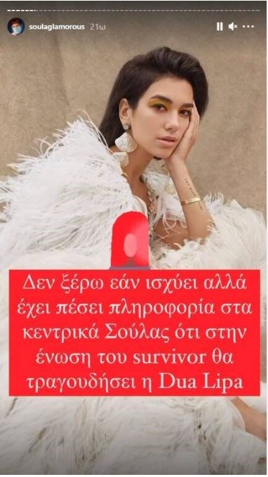 Μια αποκάλυψη, για το Survivor, με επιφύλαξη, έκανε η Soula Glamorous η οποία ανάρτησε στον δημοφιλή λογαριασμό της στο instagram τη φωτογραφία της διάσημης τραγουδίστριας Dua Lipa η οποία έχει σαρώσει σε Ελλάδα και εξωτερικό. Όπως ανέφερε η διάσημη τραγουδίστρια θα εισβάλει στο ριάλιτι επιβίωσης στις 11 Απριλίου μόλις δηλαδή οι δύο ομάδες ενωθούν.