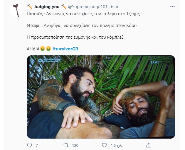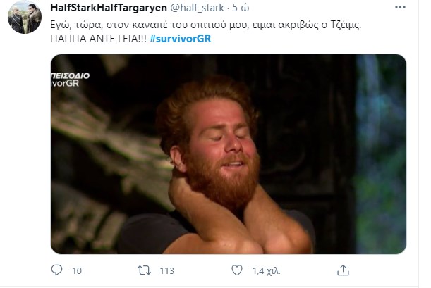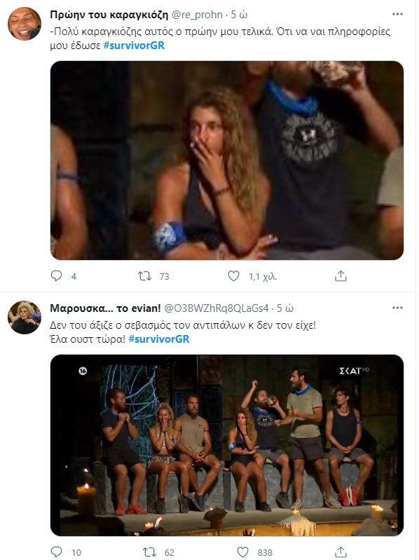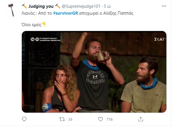 Ο Αλέξης Παππάς αποχώρησε εν μέσω πανηγυρισμών από τους συμπαίκτες του. Έτσι, ο ηθοποιός δεν θα κάνει Πάσχα στο Survivor. Το τηλεοπτικό κοινό αποφάσισε την αποχώρηση του Παππά, ενώ στο παιχνίδι παρέμειναν ο Τριαντάφυλλος και ο Γιώργος Ασημακόπουλος οι οποίοι θα παραμείνουν στο reality επιβίωσης. Το Twitter πανηγύρισε και αυτό με τη σειρά του, καθώς η πλειοψηφία των χρηστών ζητούν εδώ και καιρό την αποχώρηση του Τριαντάφυλλου και του Παππά. Κατά 50% λοιπόν το αίτημα ικανοποιήθηκε.