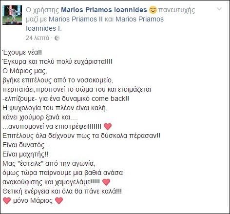 Νέες εξελίξεις δρομολογούνται στο Survivor, με αφορμή την επιστροφή του Μάριου στο παιχνίδι.Σύμφωνα, με πληροφορίες του showbiz.com.cy, ο «τρελός» Κύπριος είναι καλά στην υγεία του και ετοιμάζεται για την μεγάλη του επιστροφή στο παιχνίδι επιβίωσης.Μάλιστα στην επίσημη σελίδα του παίκτη στο facebook, γίνεται σχετική αναφορά στην επιστροφή του στο Survivor, από τους θαυμαστές του, προκαλώντας καταιγισμό σχολίων.