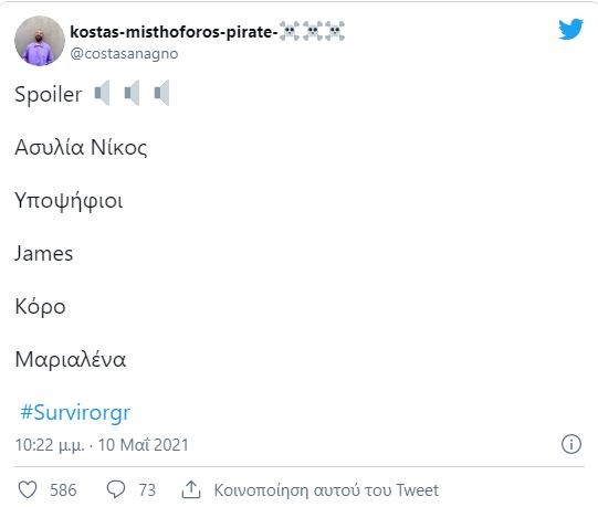 Ο Κώστας Αναγνωστόπουλος, γνωστός και ως Μισθοφόρος από τη συμμετοχή του στο Survivor, σε ανάρτηση στον προσωπικό λογαριασμό του στο Twitter έγραψε ότι αυτοί που θα βρεθούν αντιμέτωποι με τον Κόρο, θα είναι ο Τζέιμς Καφετζής και η Μαριαλένα Ρουμελιώτη καθώς η μπλε ομάδα θα χάσει για δεύτερη φορά. Ο Νίκος Μπάρτζης είναι ο παίκτης που θα κερδίσει την ασυλία.