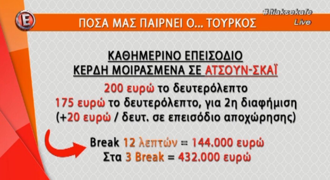 Εκτός από τα διαφημιστικά διαλείμματα, όμως, υπάρχει και η τοποθέτηση προϊόντος που προβάλλεται μέσα στο επεισόδιο. Η άμεση αναφορά διάρκειας έως 2 λεπτά κοστίζει 24.000 ευρώ, ενώ η έμμεση αναφορά έως 4 λεπτά φτάνει στα 36.000 ευρώ!