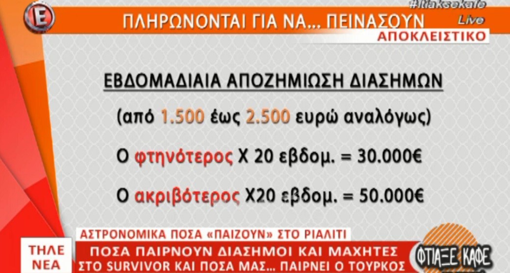 Σύμφωνα με το ρεπορτάζ της εκπομπής, οι Διάσημοι πληρώνονται κάθε εβδομάδα από 1.500 έως 2.500 ευρώ. Δηλαδή, για 20 εβδομάδες παραμονής στον Άγιο Δομίνικο, ο παίκτης με τον μικρότερο μισθό παίρνει 30.000 ευρώ και ο πιο ακριβοπληρωμένος φτάνει στα 50.000 ευρώ.