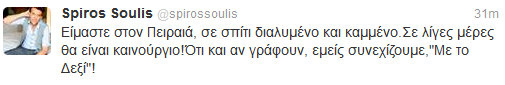 Το τελευταίο διάστημα κυκλοφορούσαν φήμες που ήθελαν την εκπομπή του Σπύρου Σούλη “Με το Δεξί” να ολοκληρώνει πρόωρα τον κύκλο της!Ο γνωστός παρουσιαστής έβαλε τα πράγματα στη θέση τους μέσω twitter!!!